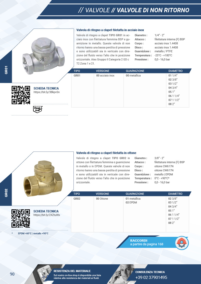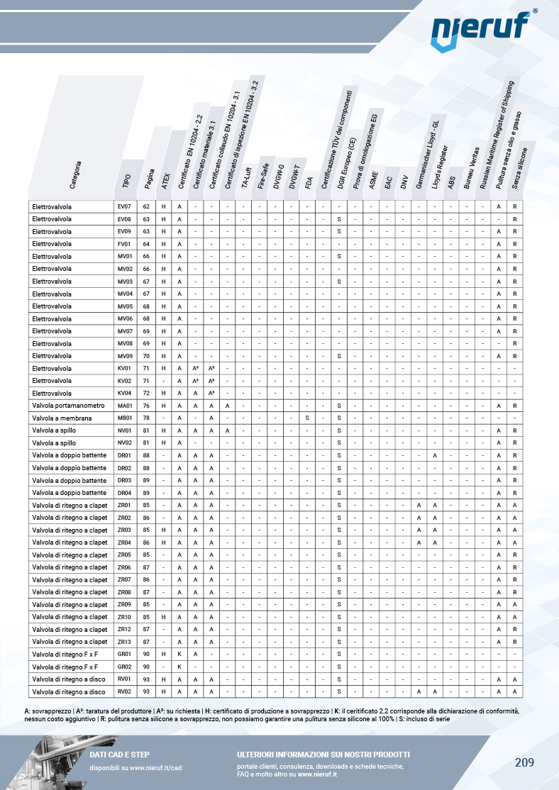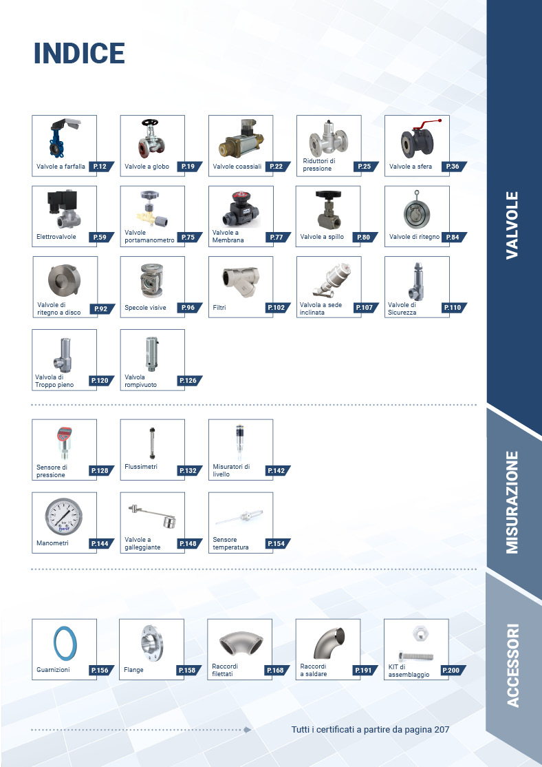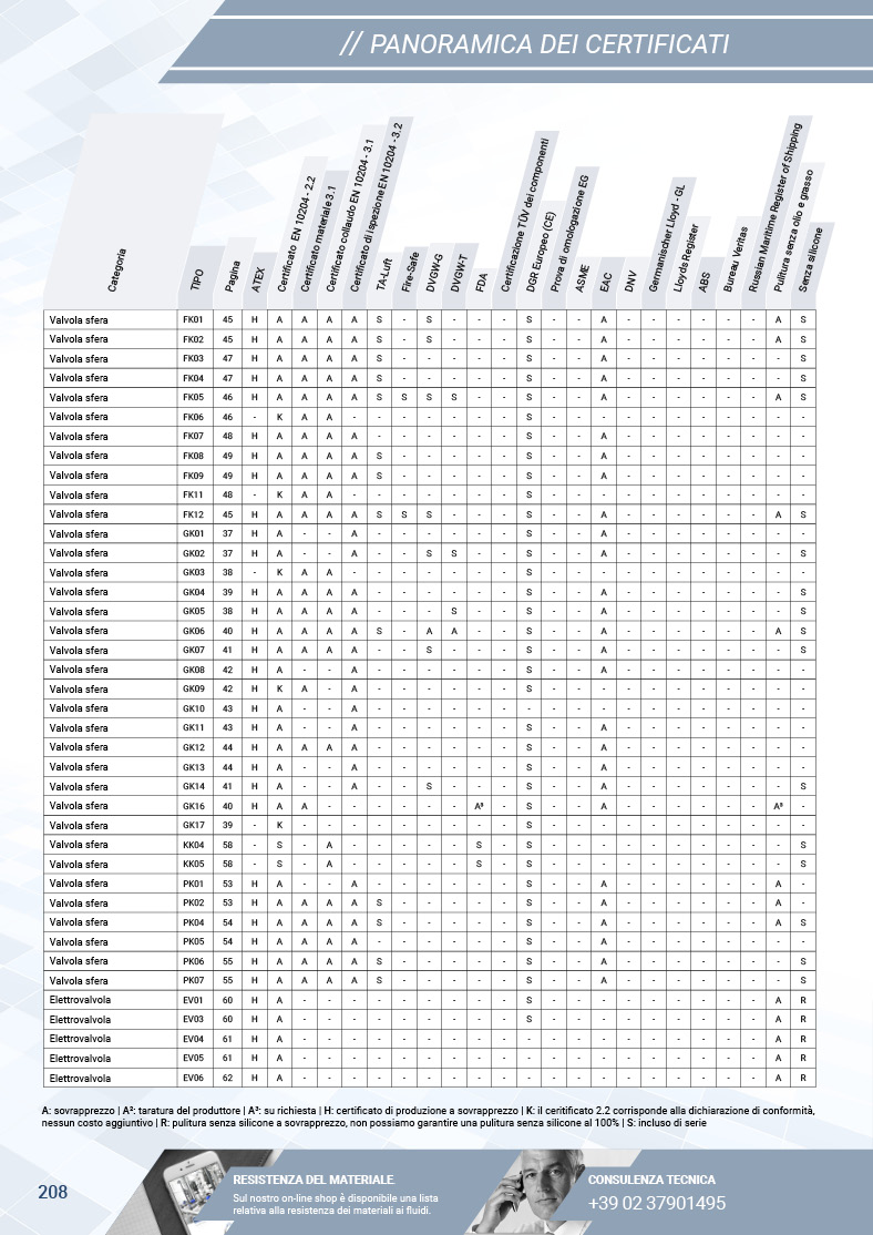 L'indice nelle ultime pagine del catalogo mostra per ogni articolo la disponibilità e le condizioni di richiesta dei certificati per le valvole.