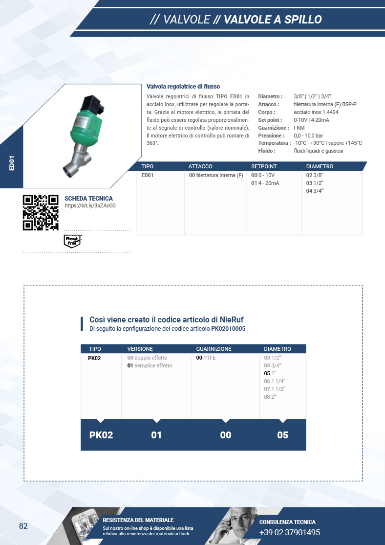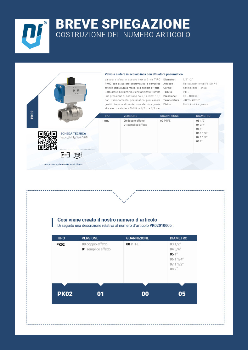 Grazie al nostro sistema di configurazione dei codici degli articoli, è possibile rilevare in modo sempice e intuitivo le caratteristiche principali dei prodotti dai codici stessi. A seconda della valvola il codice viene genarato in base alla scelta del modello, del design, della funzione e delle dimensioni.