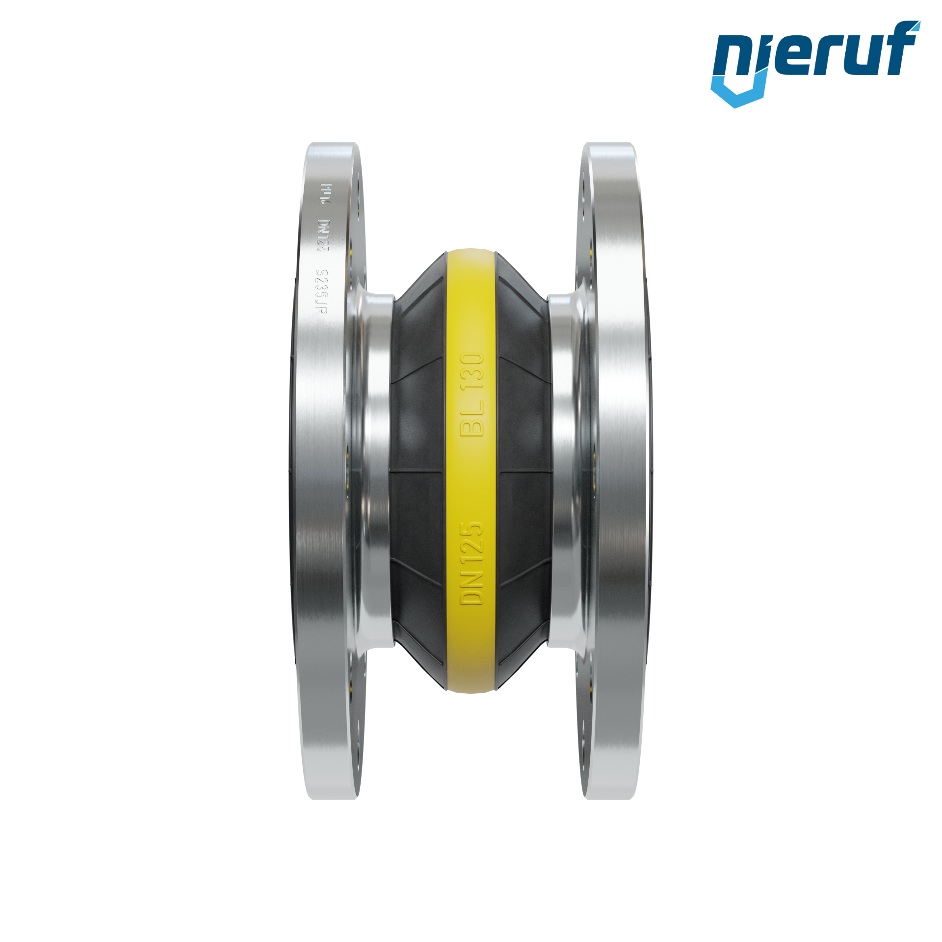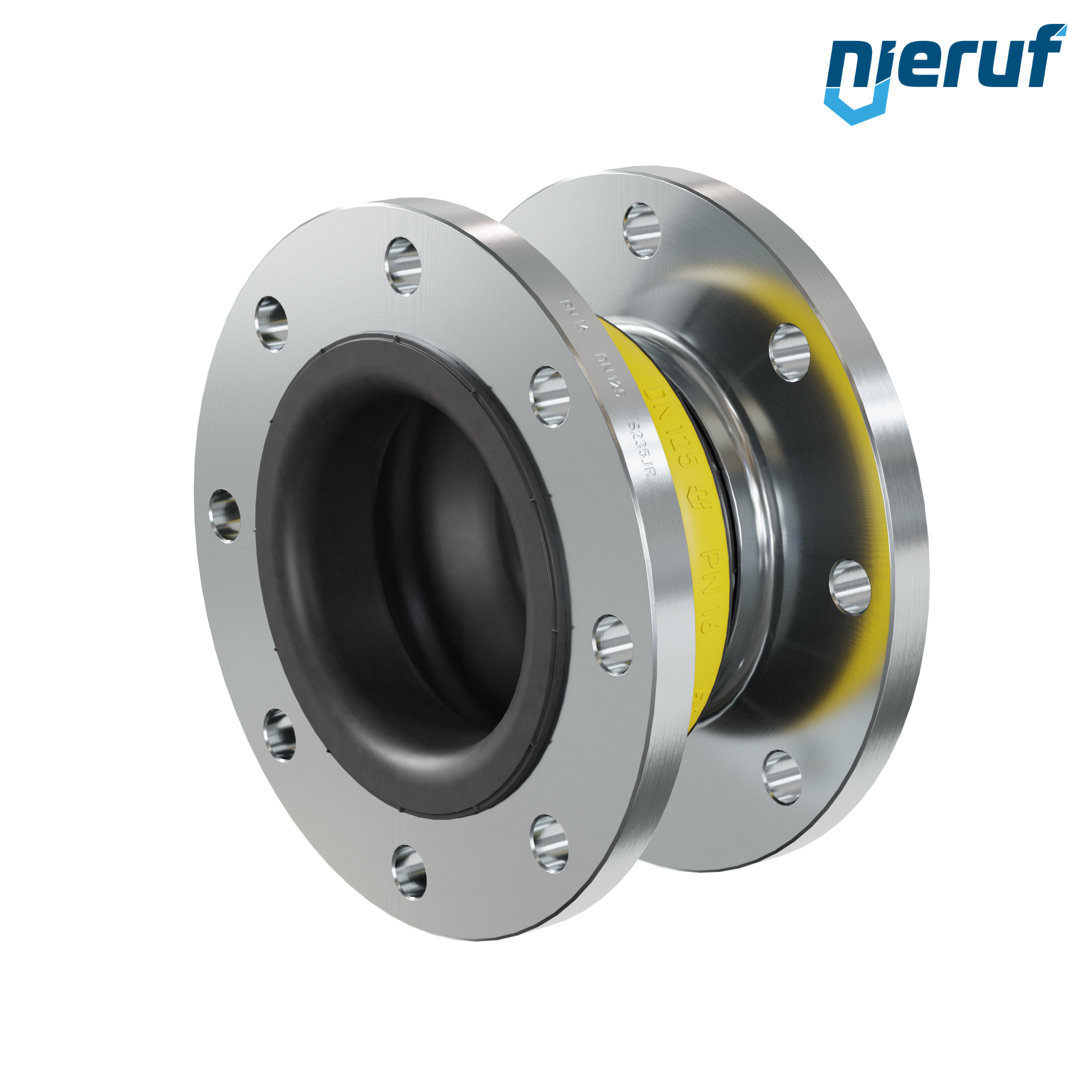 Compensatore in gomma di alta qualità con guarnizione in NBR e flange in acciaio. Questa versione può essere ampliata con un rivestimento in PTFE, anelli di supporto del vuoto e altre opzioni su richiesta.