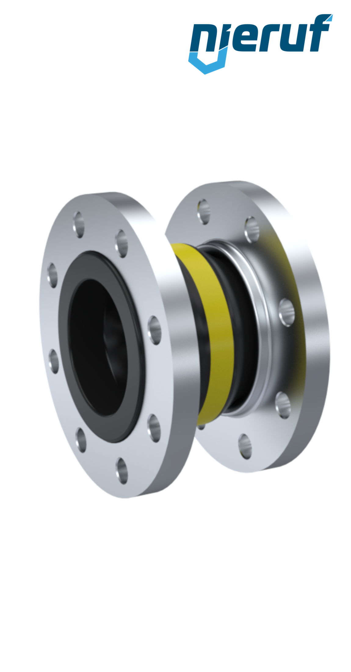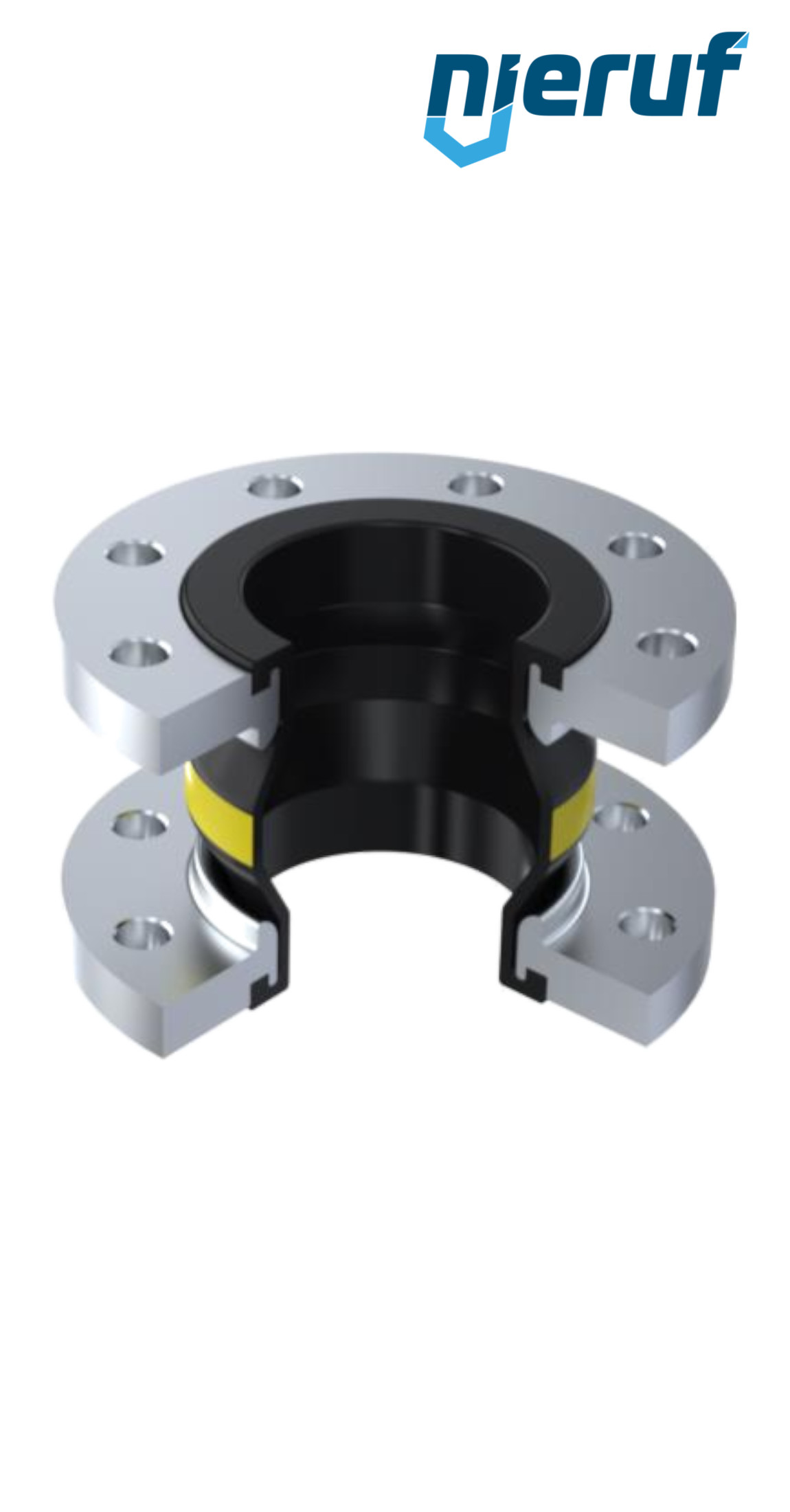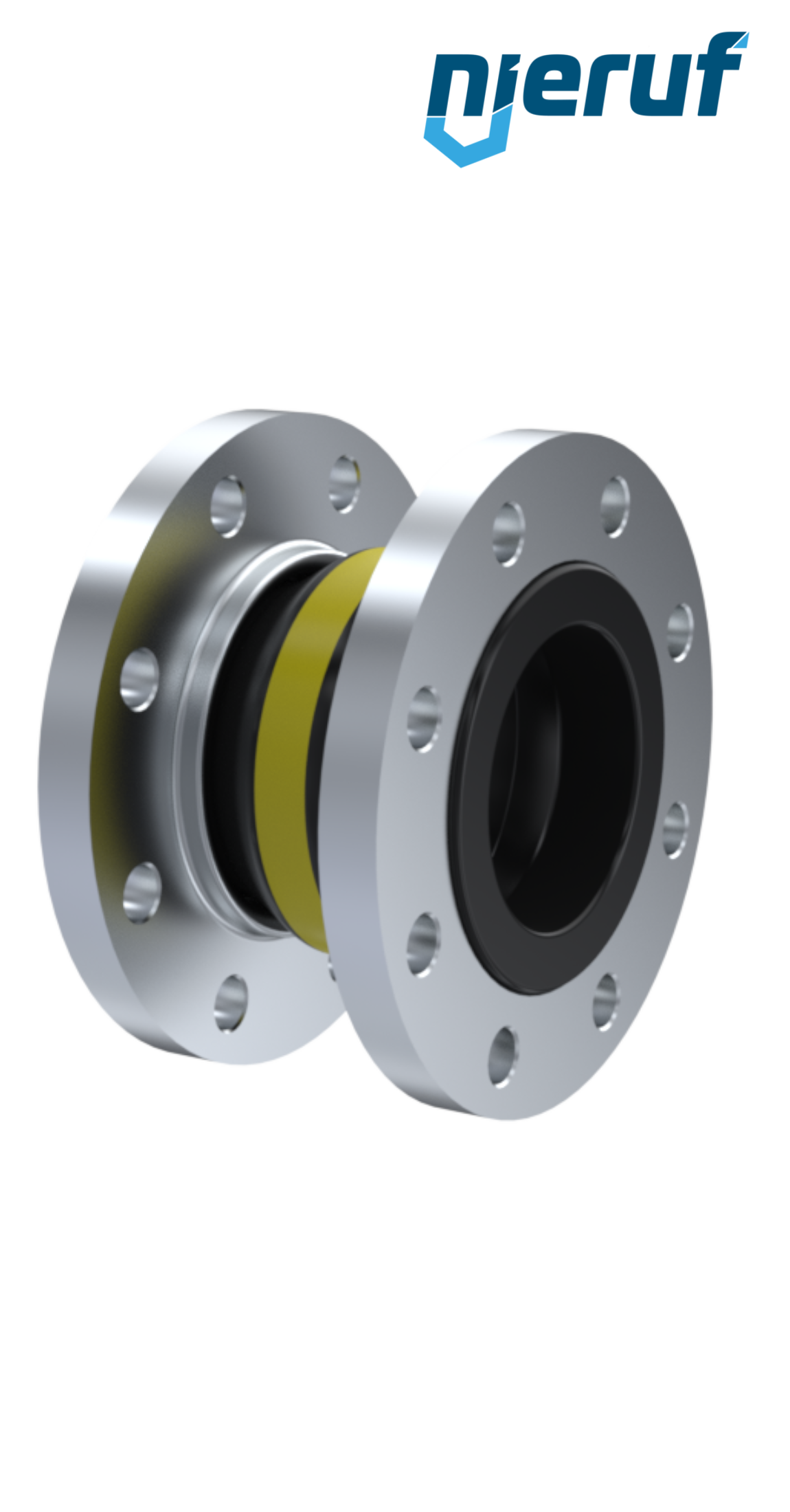 Compensatore in gomma di alta qualità con guarnizione in NBR e flange in acciaio inossidabile. Questa versione può essere ampliata con un rivestimento in PTFE, anelli di supporto del vuoto e altre opzioni su richiesta.