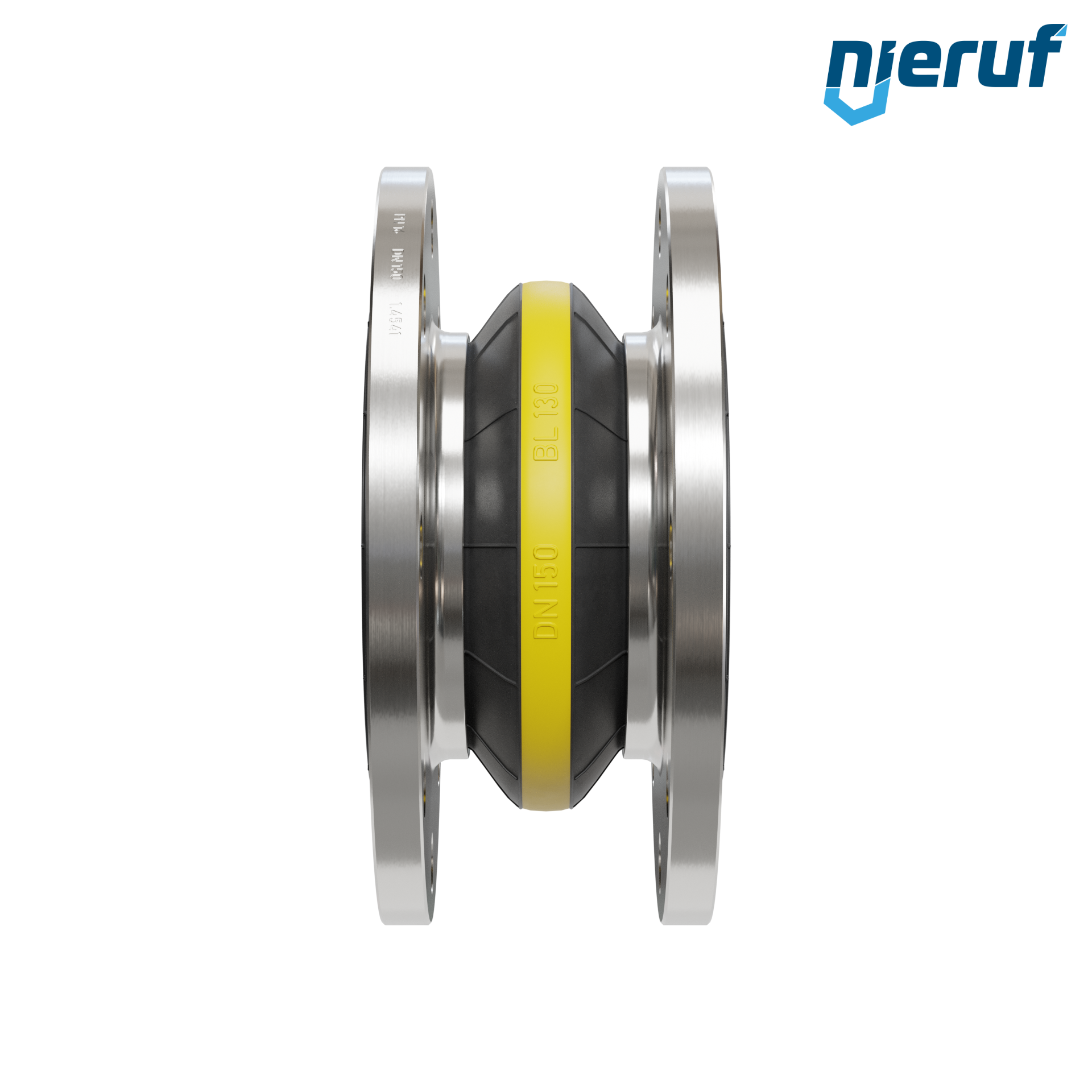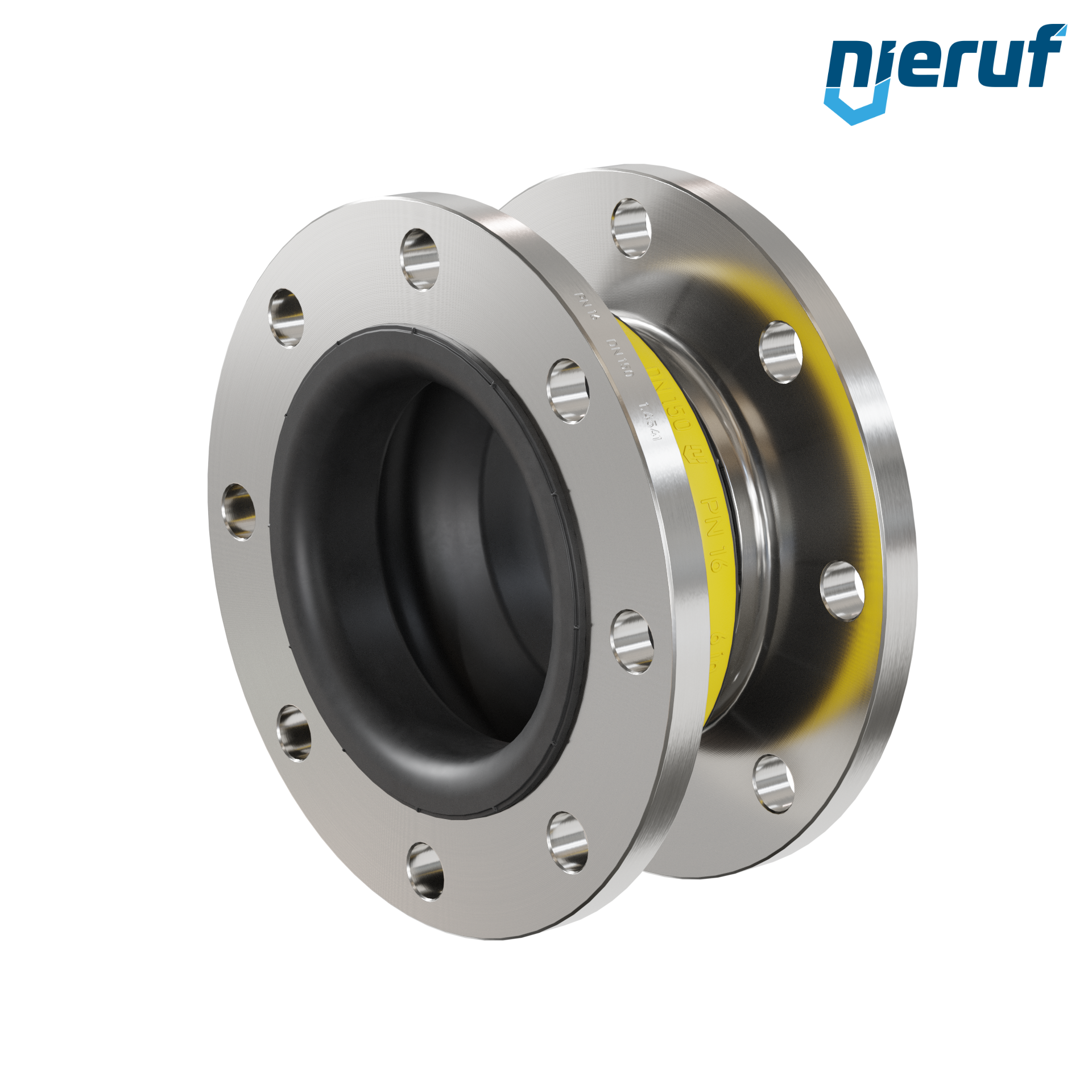 Compensatore in gomma di alta qualità con guarnizione in NBR e flange in acciaio inossidabile. Questa versione può essere ampliata con un rivestimento in PTFE, anelli di supporto del vuoto e altre opzioni su richiesta.