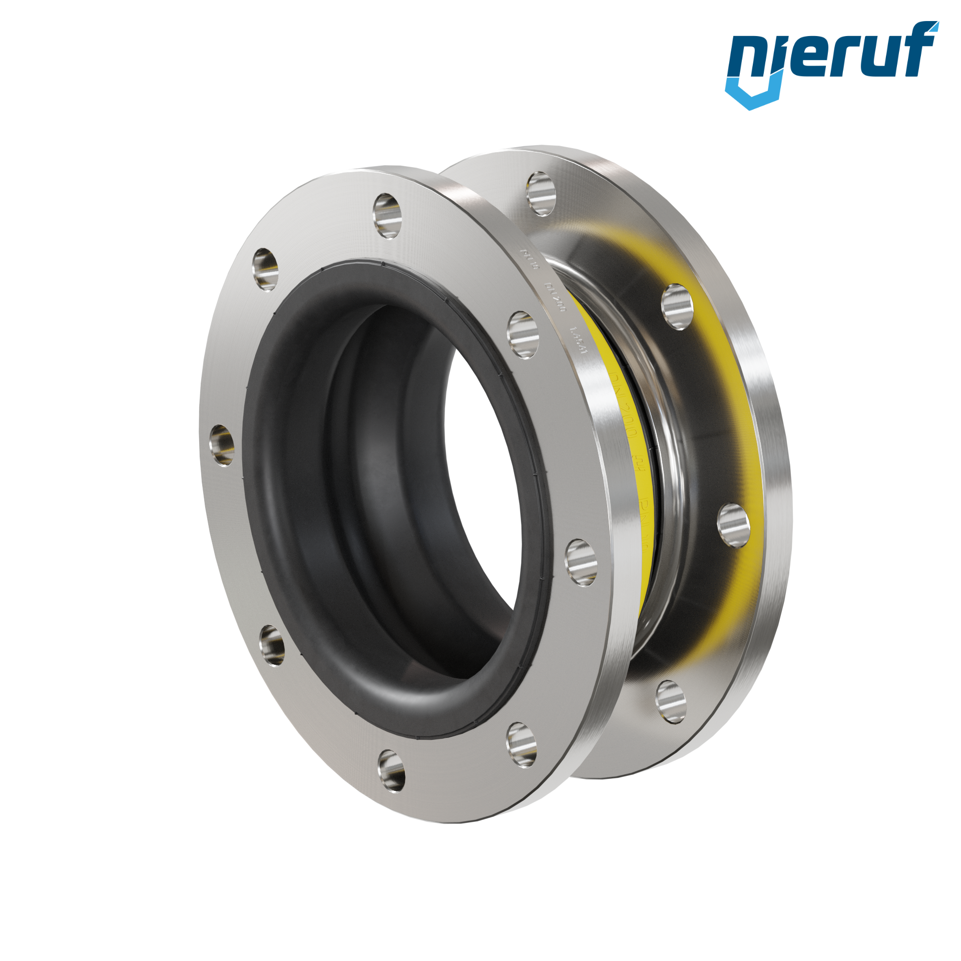 Compensatore in gomma di alta qualità con guarnizione in NBR e flange in acciaio inossidabile. Questa versione può essere ampliata con un rivestimento in PTFE, anelli di supporto del vuoto e altre opzioni su richiesta.