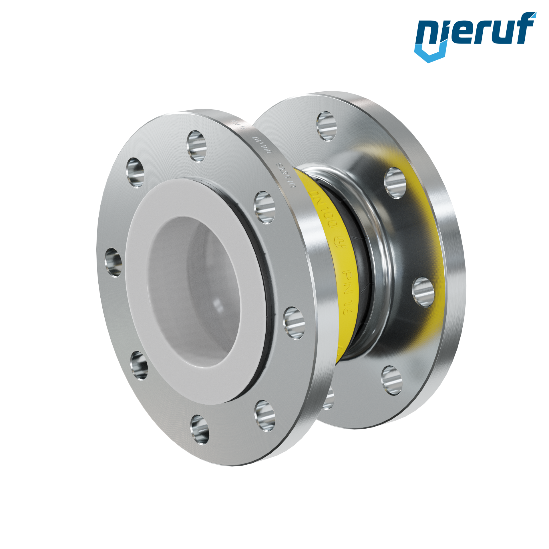 Compensatore di qualità con manicotto in NBR e flange in acciaio. Dispone della certificazione FDA. Inoltre è dotato di un rivestimento in PTFE, che gli conferisce un'elevata resistenza chimica grazie alla superficie interna liscia.