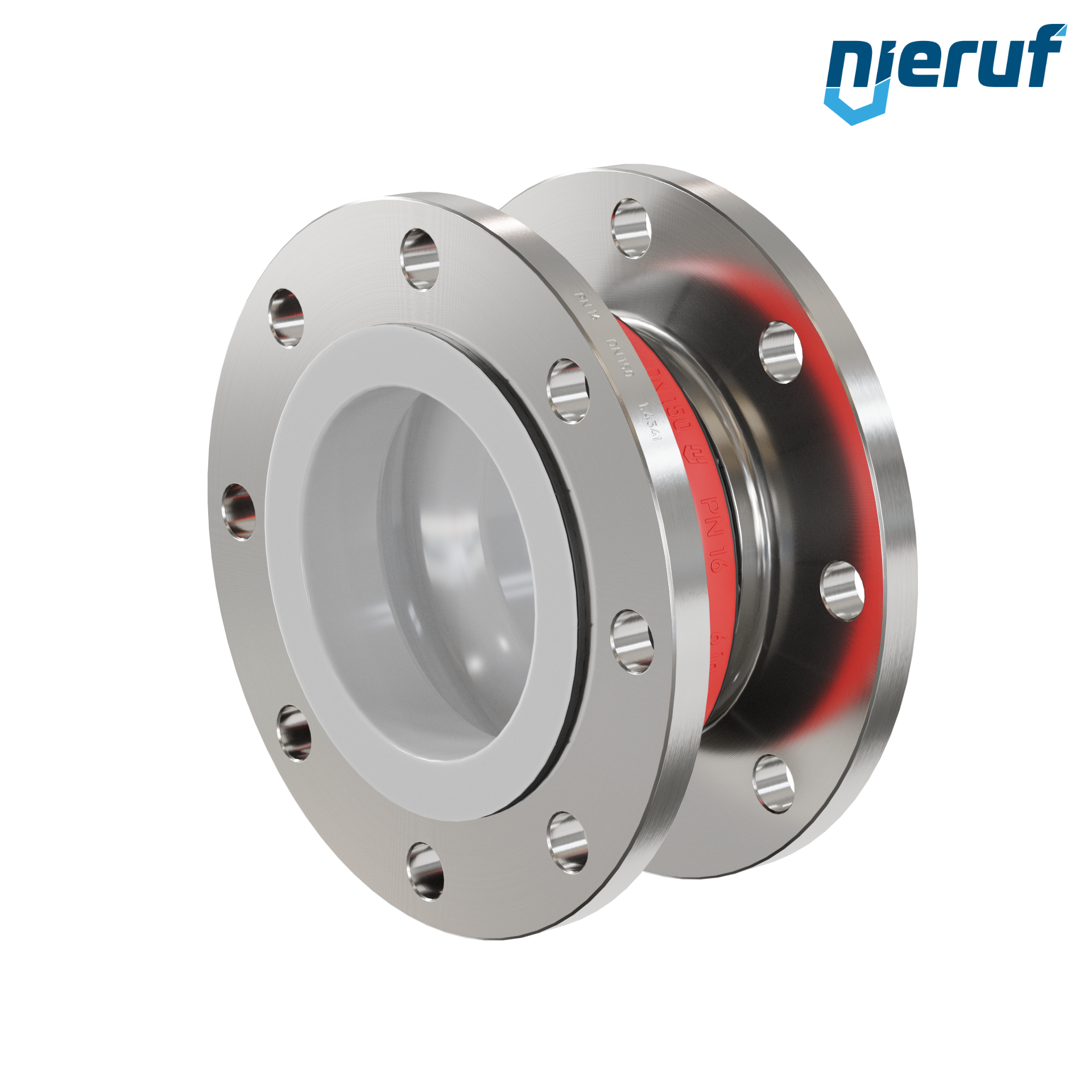 Compensatore di qualità con manicotto in EPDM e flange in acciaio inox. Dispone della certificazione FDA. Inoltre è dotato di un rivestimento in PTFE, che gli conferisce un'elevata resistenza chimica grazie alla superficie interna liscia.