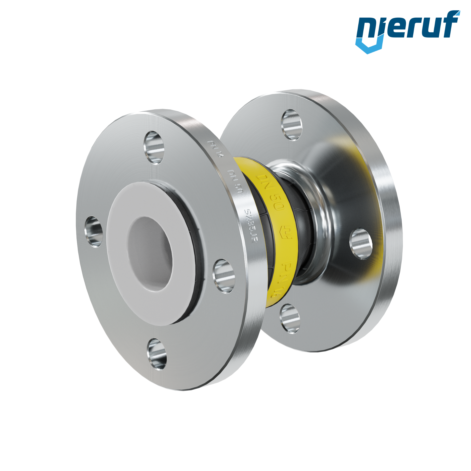 Compensatore di qualità con manicotto in NBR e flange in acciaio. Dispone della certificazione FDA. Inoltre è dotato di un rivestimento in PTFE, che gli conferisce un'elevata resistenza chimica grazie alla superficie interna liscia.