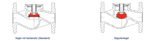 Der Regulierkegel ist im gegensatz zu dem Randsitzkegel abgerundet. Dadurch kann eine genauere Dosierung/Steuerung des Mediums vorgenommen werden.