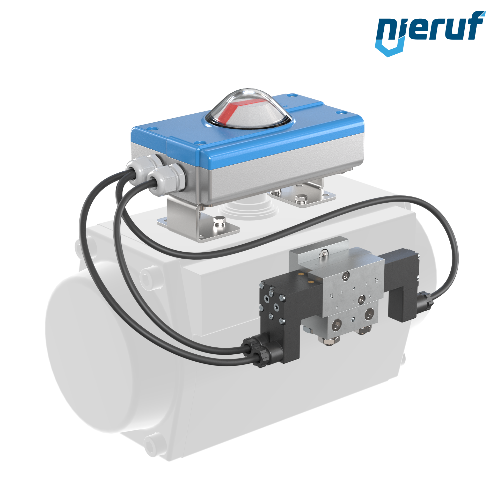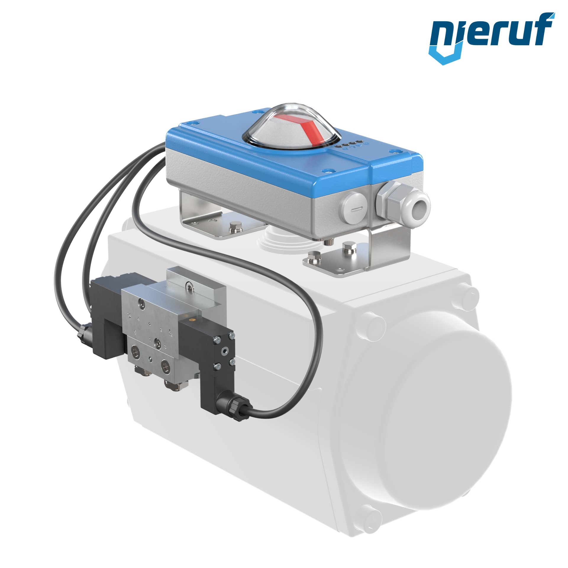 Posizionatore per la regolazione e il controllo, nonché per il posizionamento preciso di attuatori pneumatici. Possibilità di passare dalla modalità di posizionamento a quella a 3 posizioni. Staffa di montaggio compatibile, gruppo di elettrovalvole e connessioni per cavi inclusi nella fornitura.