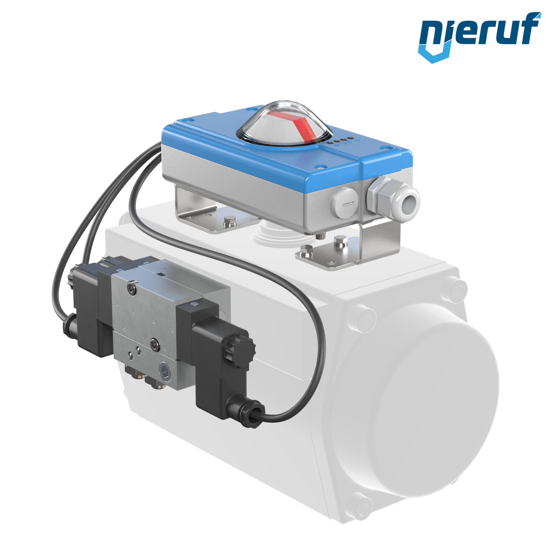 Posizionatore per la regolazione e il controllo, nonché per il posizionamento preciso di attuatori pneumatici. Possibilità di passare dalla modalità di posizionamento a quella a 3 posizioni. Staffa di montaggio compatibile, gruppo di elettrovalvole e connessioni per cavi inclusi nella fornitura.
