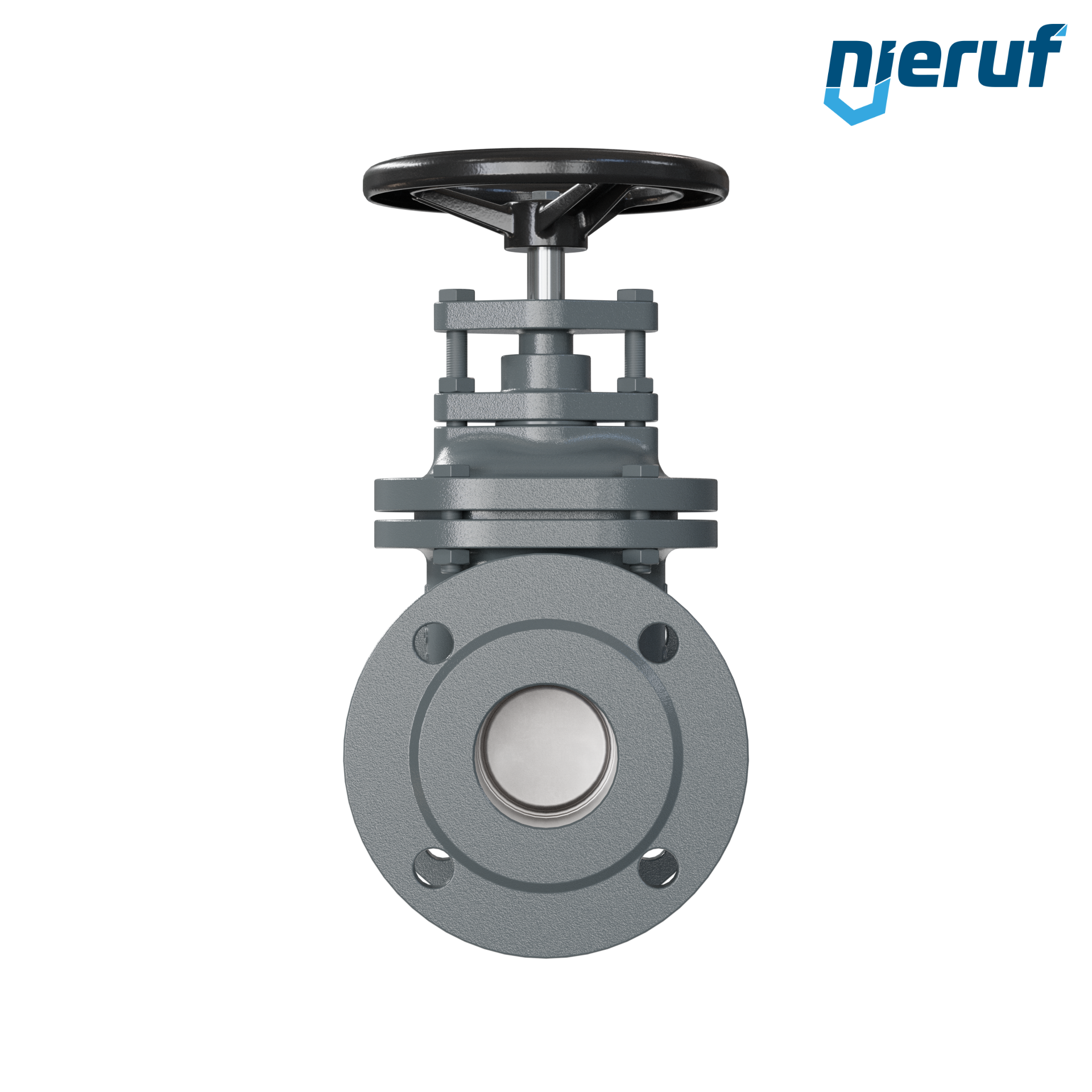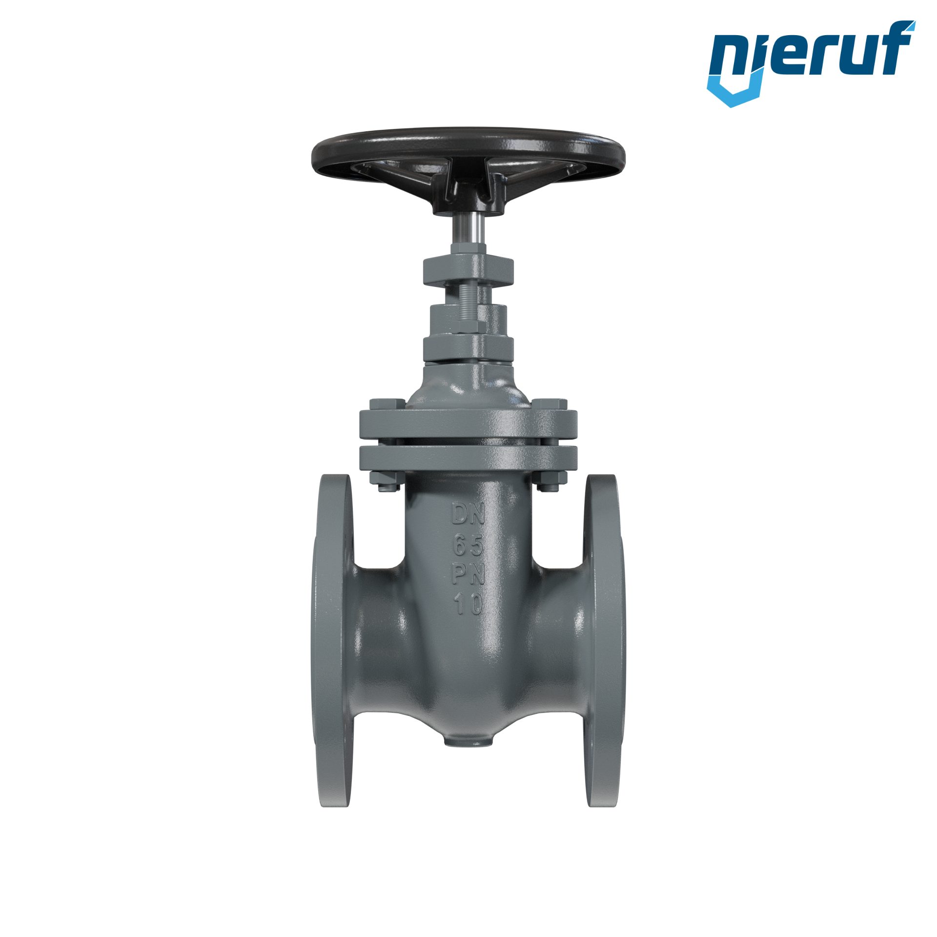valvola a saracinesca a corpo piatto in ghisa in forma lineare con attacco flangiato, stelo interno non ascendente e volantino non ascendente.