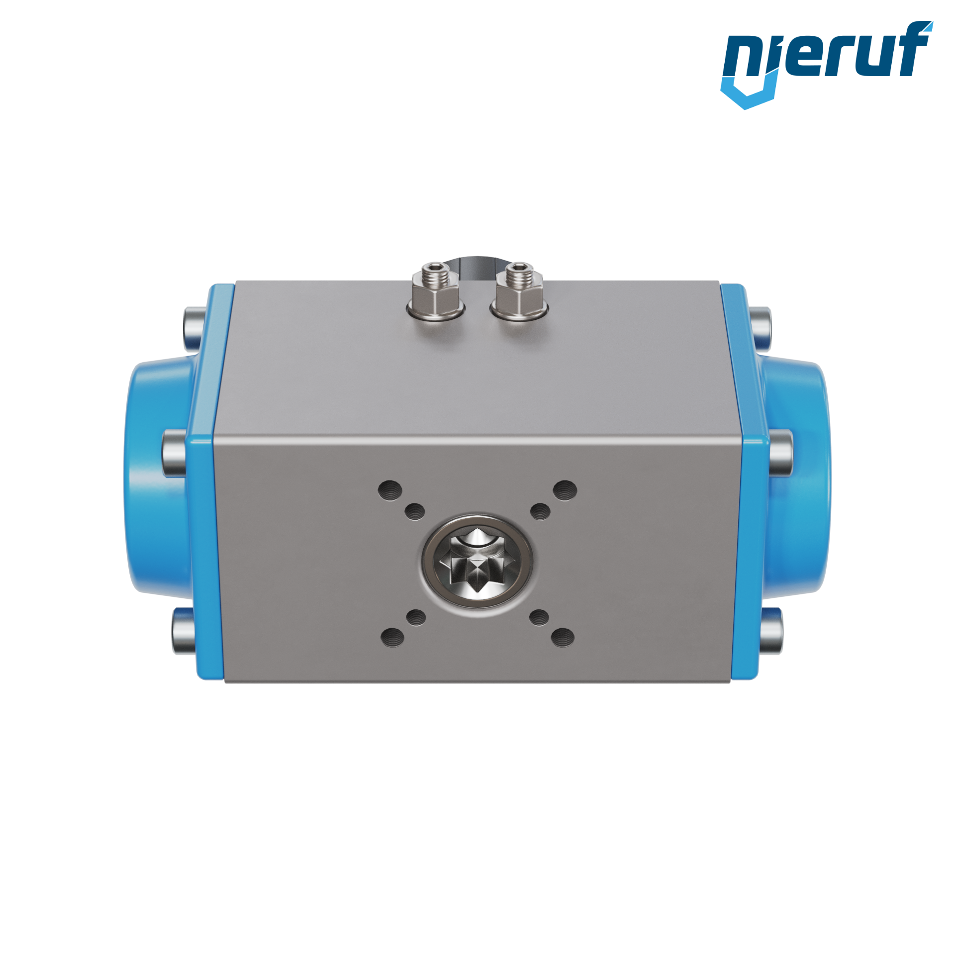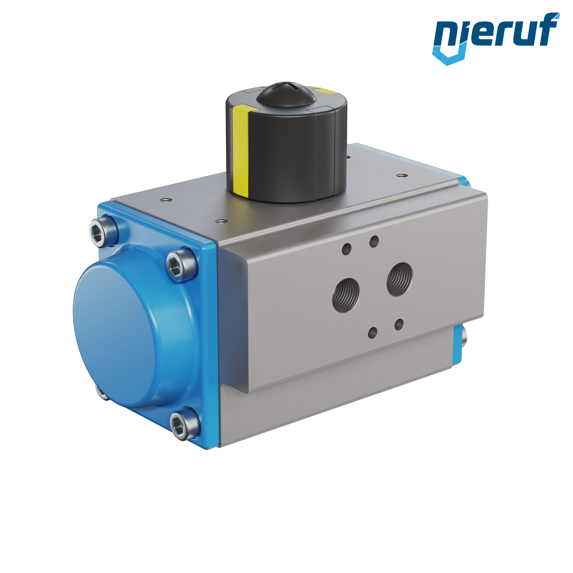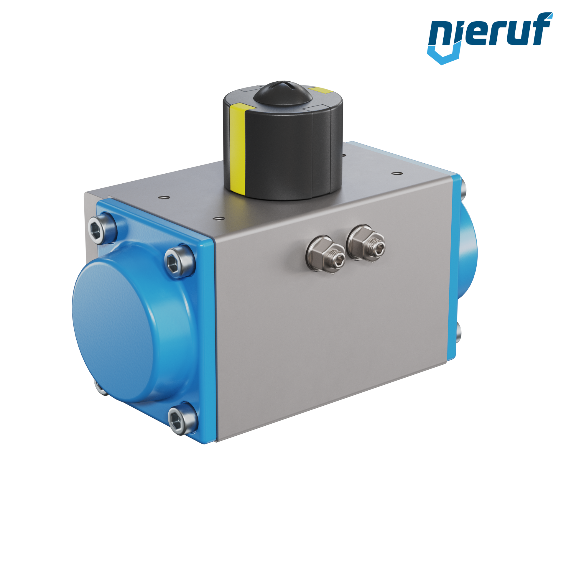 Attuatore pneumatico dal design compatto a semplice effetto versione con apertura a molla per il controllo e la regolazione delle valvole. Angolo di rotazione preimpostato a 90° con indicatore visivo della posizione.
