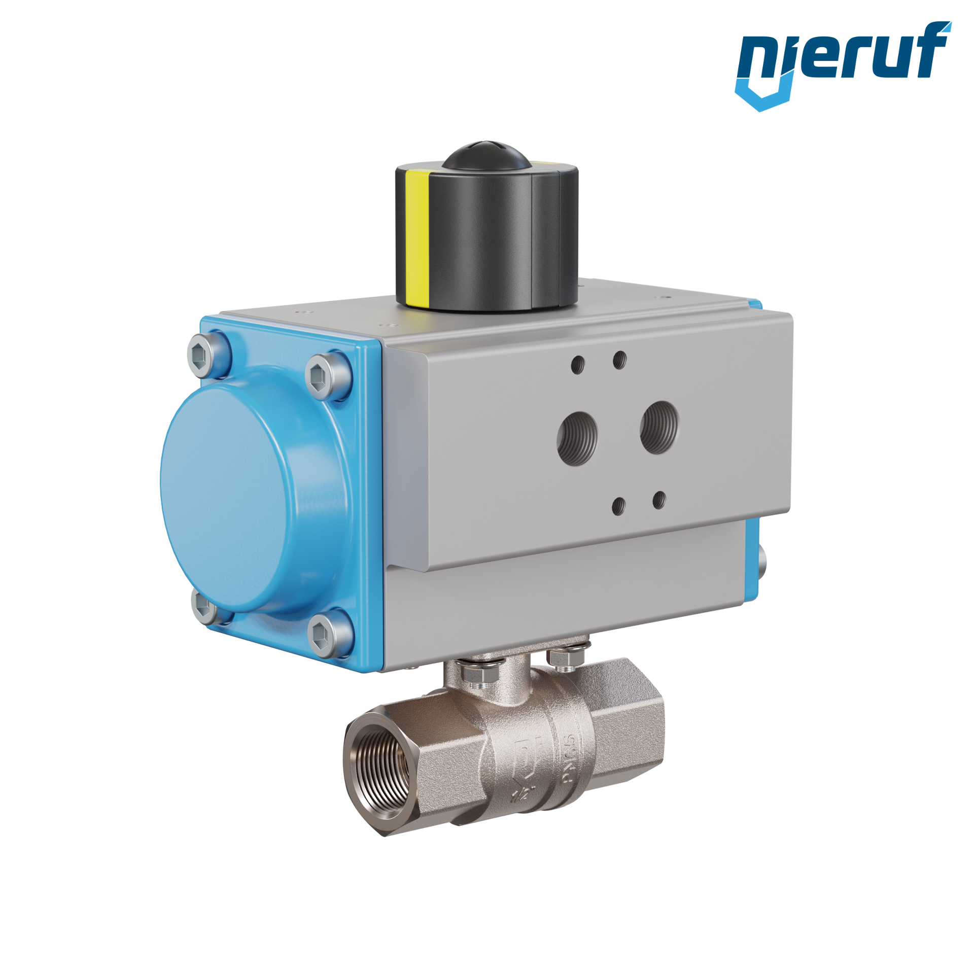 Per questa valvola a sfera automatica di alta qualità in acciaio inossidabile con manicotto ed azionamento pneumatico rotativo (GS = effetto semplice), l'attuatore è posizionato direttamente sulla valvola a sfera e la stessa viene azionata tramite aria compressa filtrata.