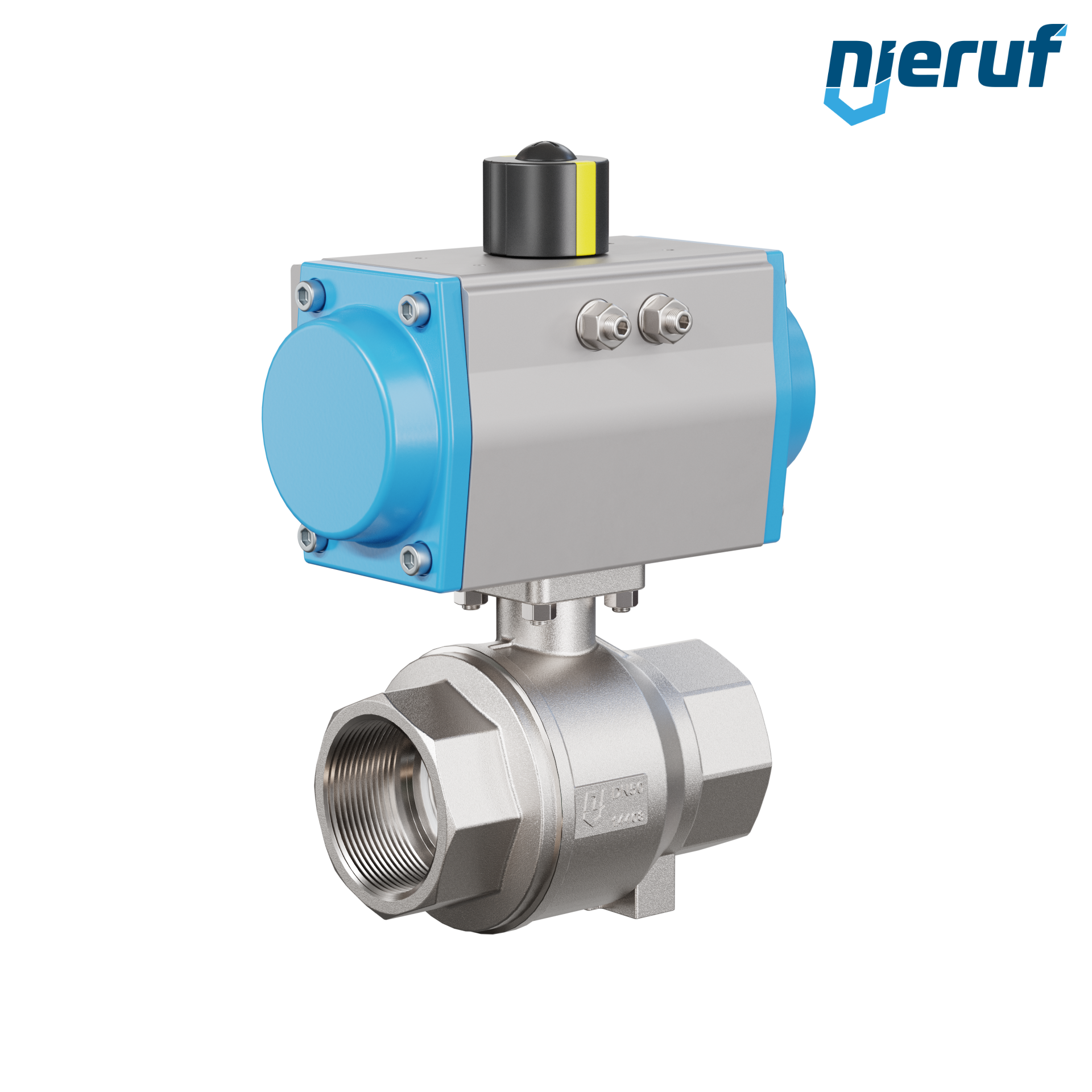 Per questa valvola a sfera automatica di alta qualità in acciaio inossidabile con manicotto ed azionamento pneumatico rotativo (GS = effetto semplice), l'attuatore è posizionato direttamente sulla valvola a sfera e la stessa viene azionata tramite aria compressa filtrata.
