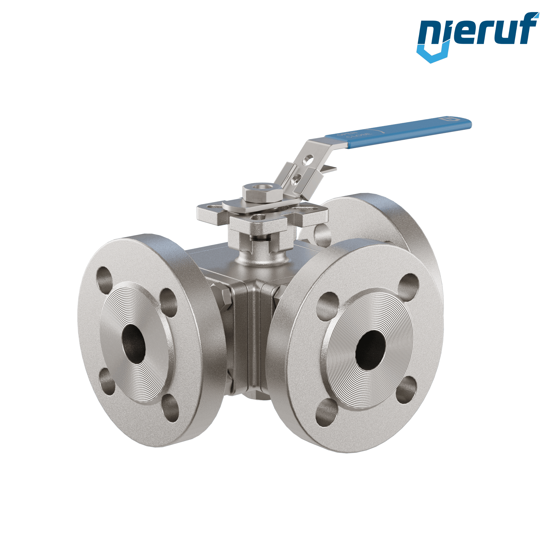 questa valvola a sfera flangiata a tre vie di alta qualità in acciaio inossidabile con copertura e flangia di montaggio secondo DIN ISO 5211 ha le seguenti omologazioni / certificazioni: PED 97/23 / EG, categoria 3 modulo H, TA-aria 2002. questa valvola a sfera ha un incavo a T (T3).