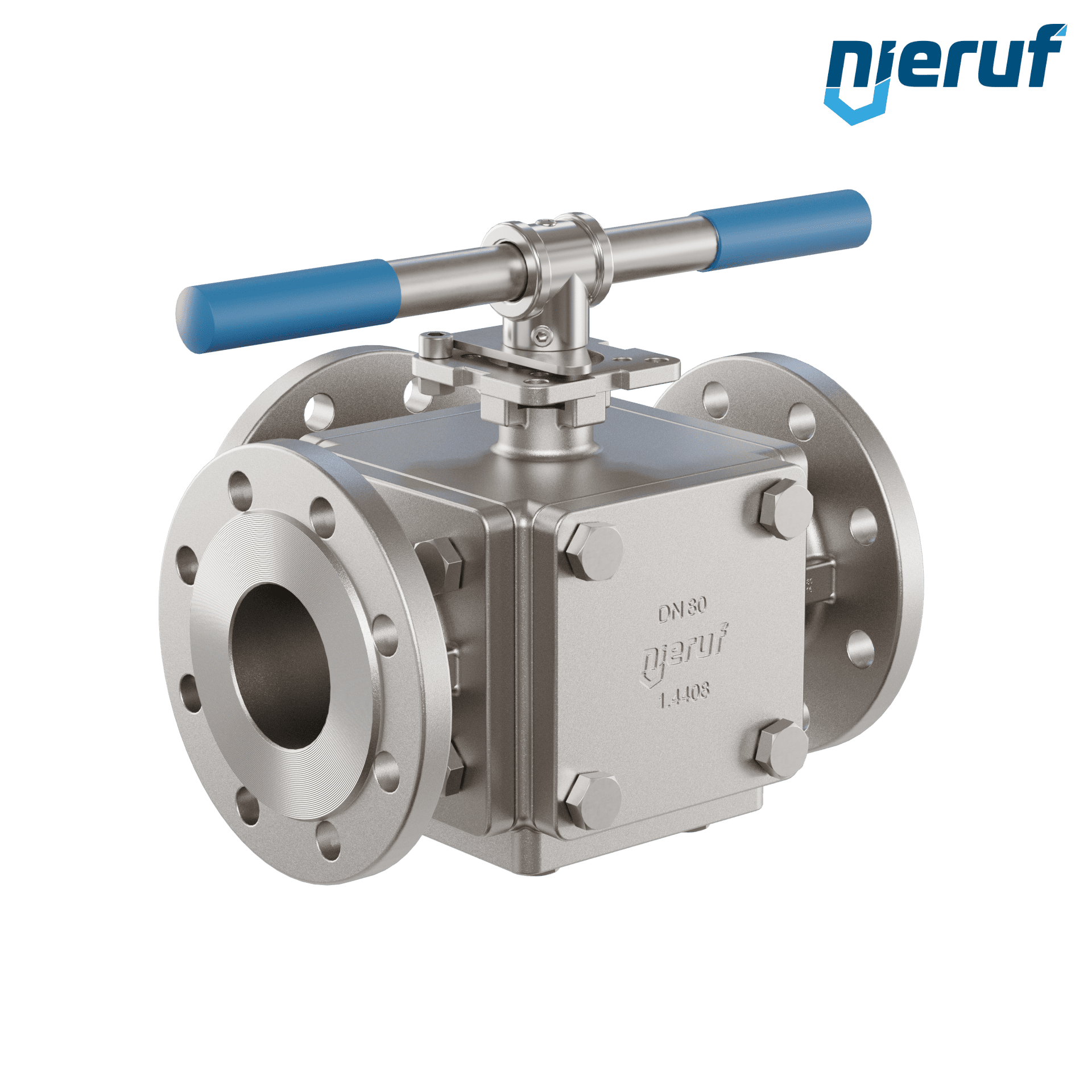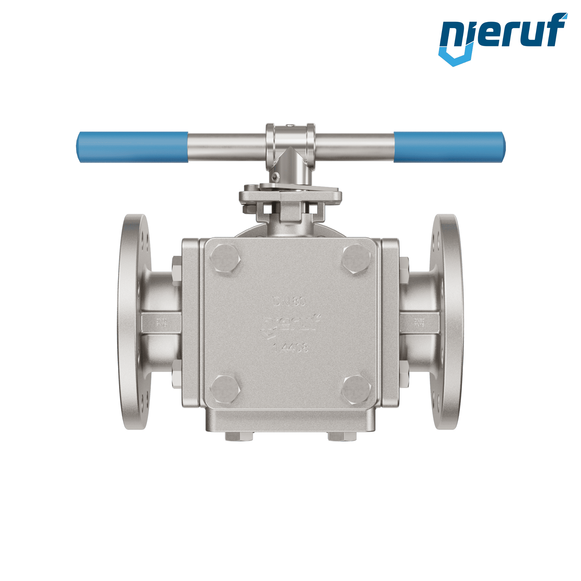 questa valvola a sfera flangiata a tre vie di alta qualità in acciaio inossidabile con copertura e flangia di montaggio secondo DIN ISO 5211 ha le seguenti omologazioni / certificazioni: PED 97/23 / EG, categoria 3 modulo H, TA-aria 2002. questa valvola a sfera ha un incavo a T (T3).