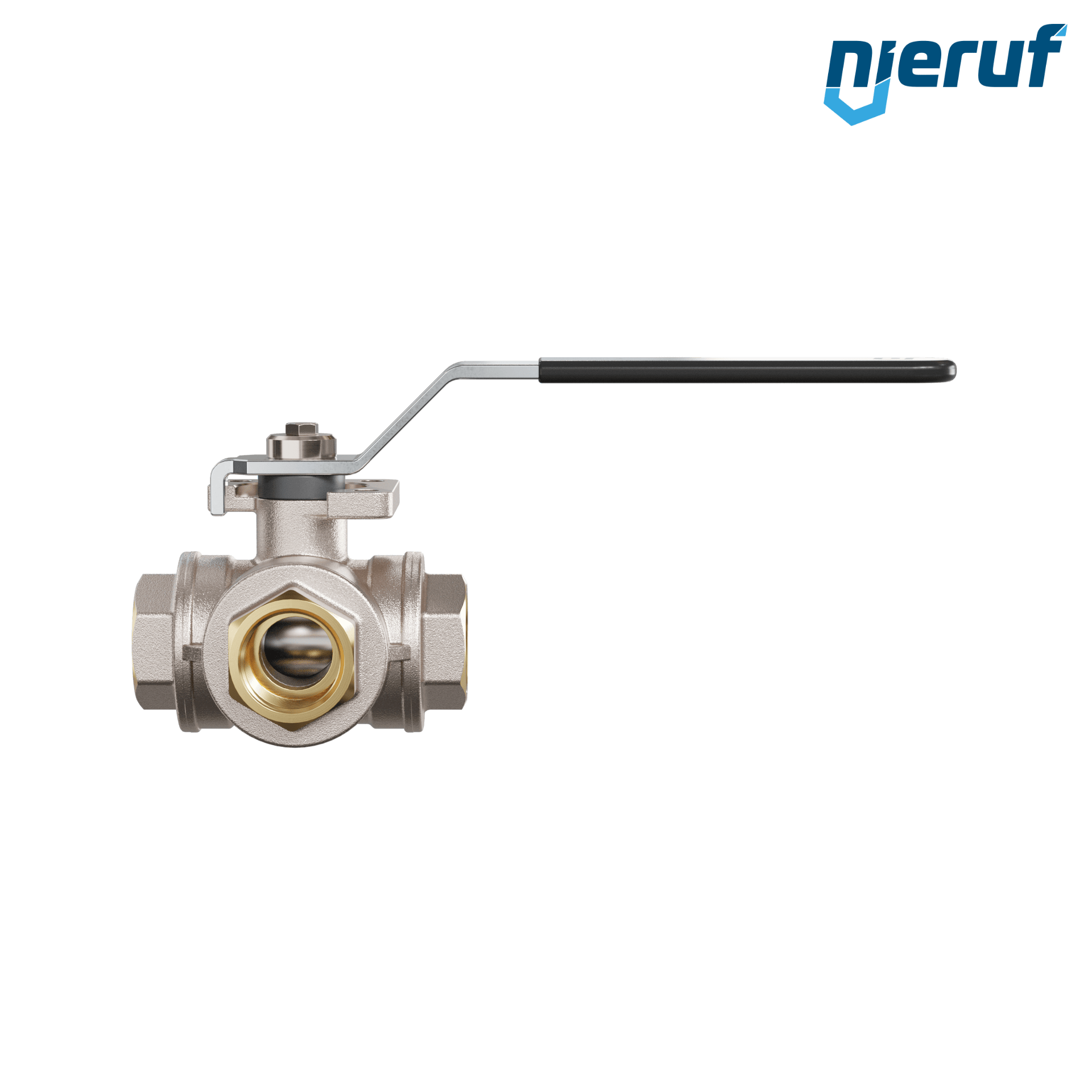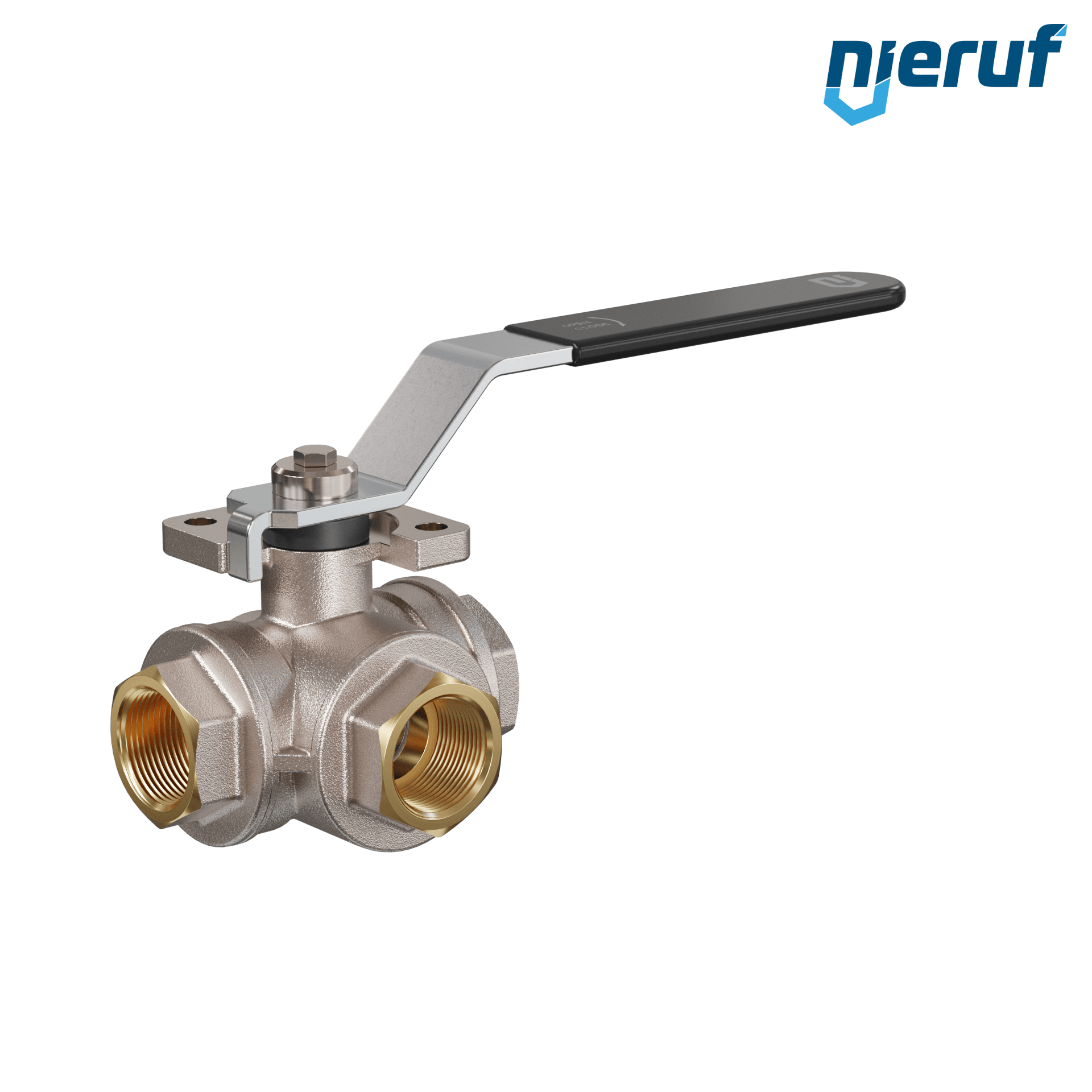Valvola a sfera a tre vie in ottone con scatola a stoppa e sfera galleggiante ed incavo a forma di L