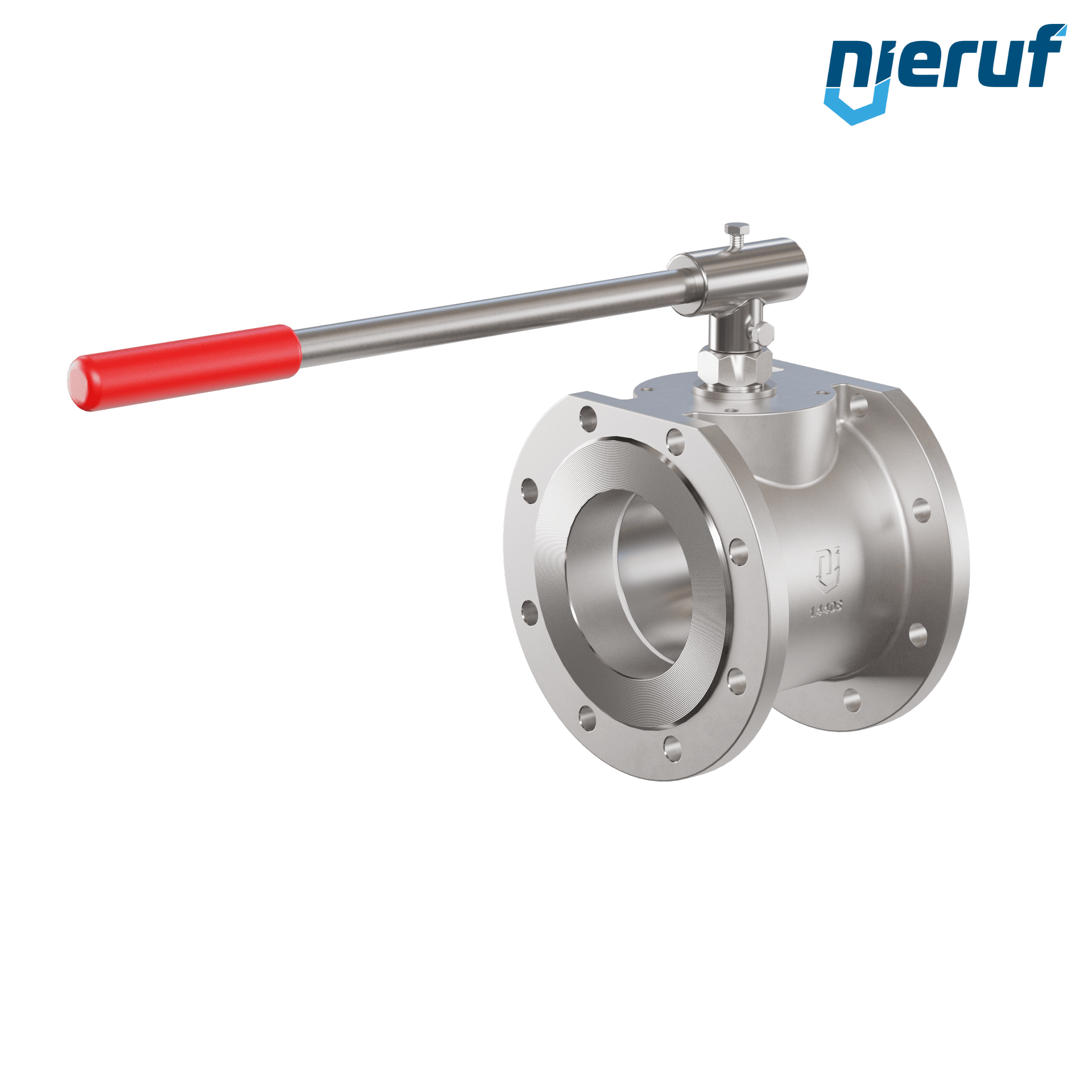 Valvola a sfera dal design compatto in acciaio inossidabile con leva e sfera in acciaio inossidabile. Flange con foro passante metrico per il bloccaggio di fluidi all'interno di un impianto.