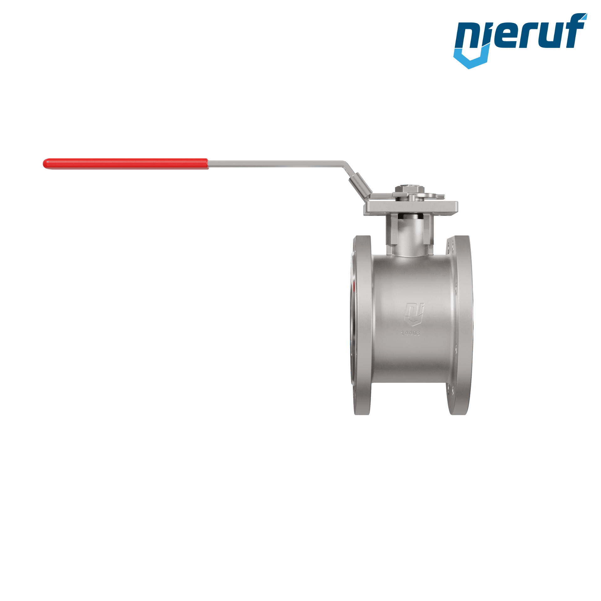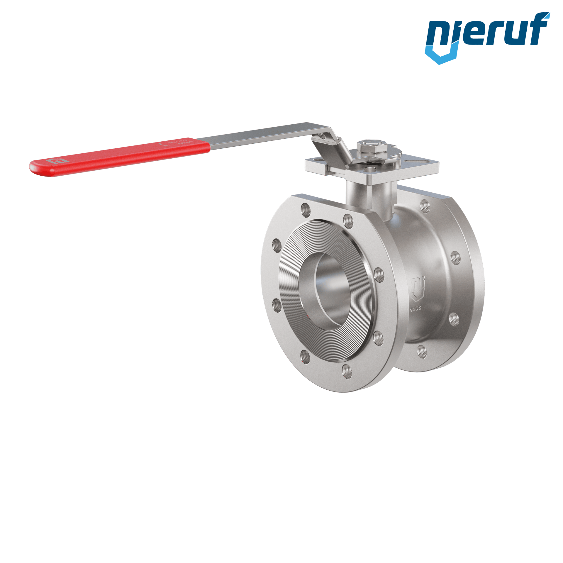 Valvola a sfera dal design compatto in acciaio inossidabile con leva e sfera in acciaio inossidabile. Flange con foro passante metrico per il bloccaggio di fluidi all'interno di un impianto.