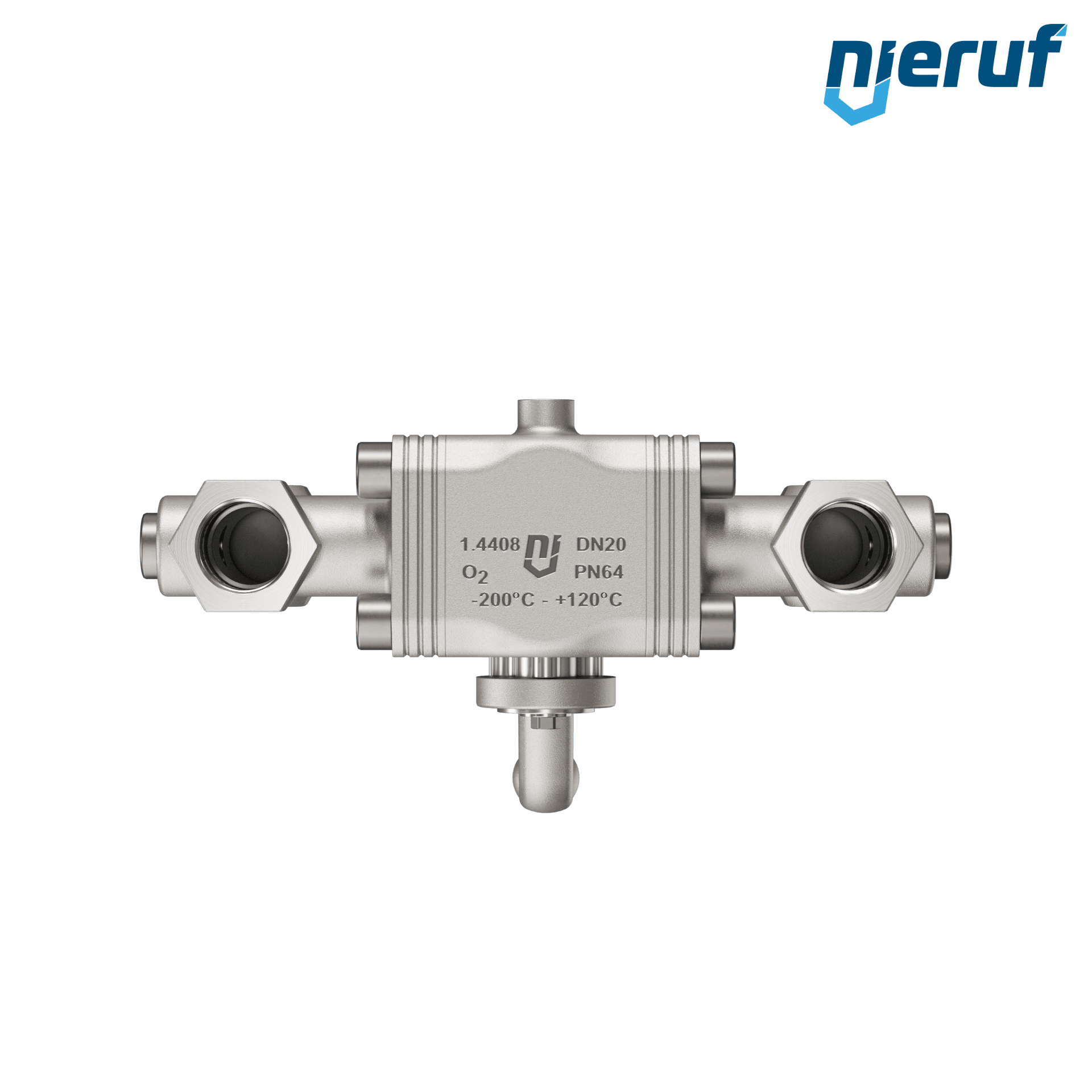 Valvola a sfera in acciaio inossidabile con attacco filettato per il montaggio di due valvole di sicurezza, al fine di proteggere i contenitori di gas liquefatti criogenici. Incavo a forma di T.