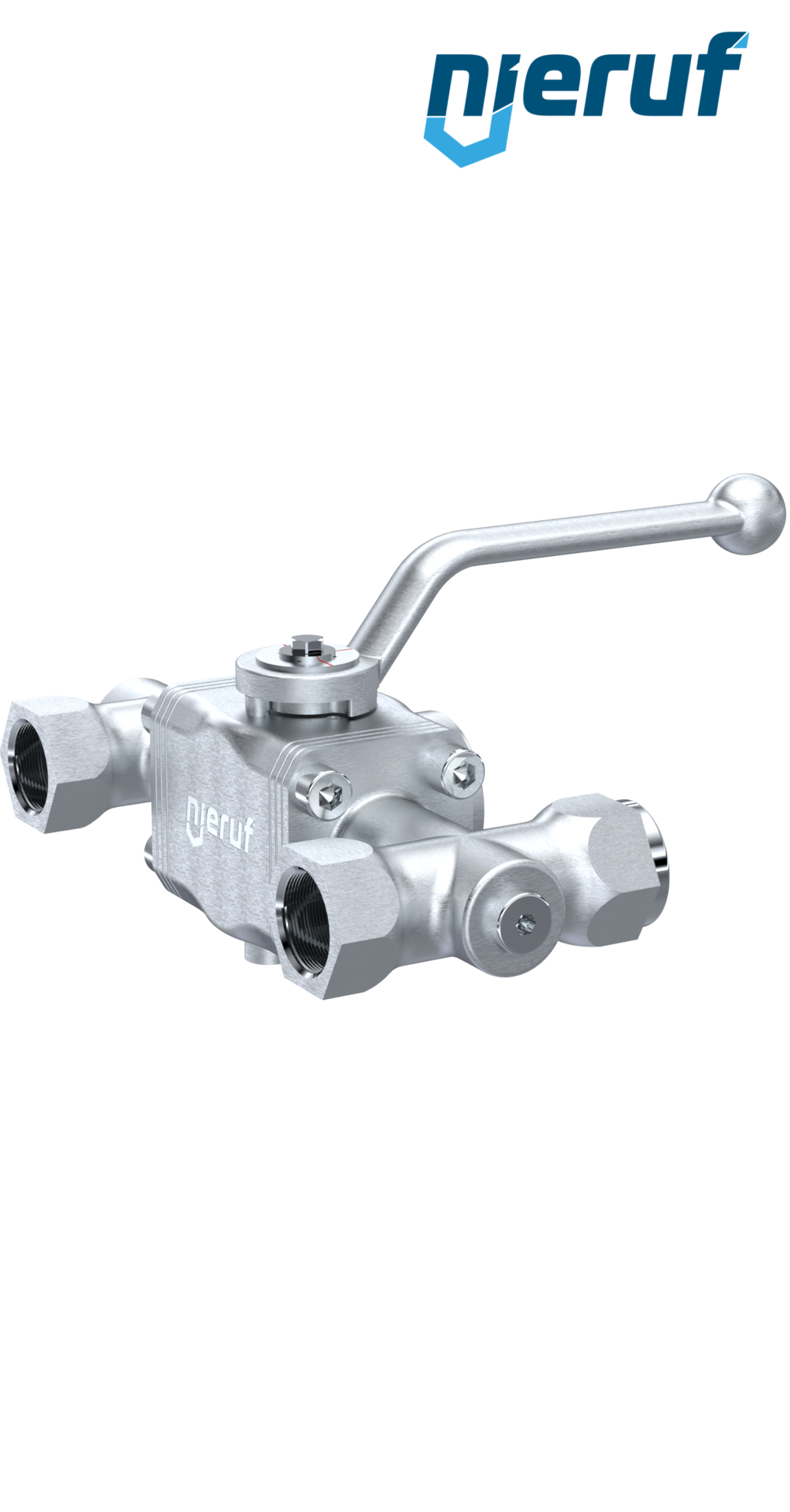 Valvola a sfera in acciaio inossidabile con attacco filettato per il montaggio di due valvole di sicurezza, al fine di proteggere i contenitori di gas liquefatti criogenici. Incavo a forma di T.