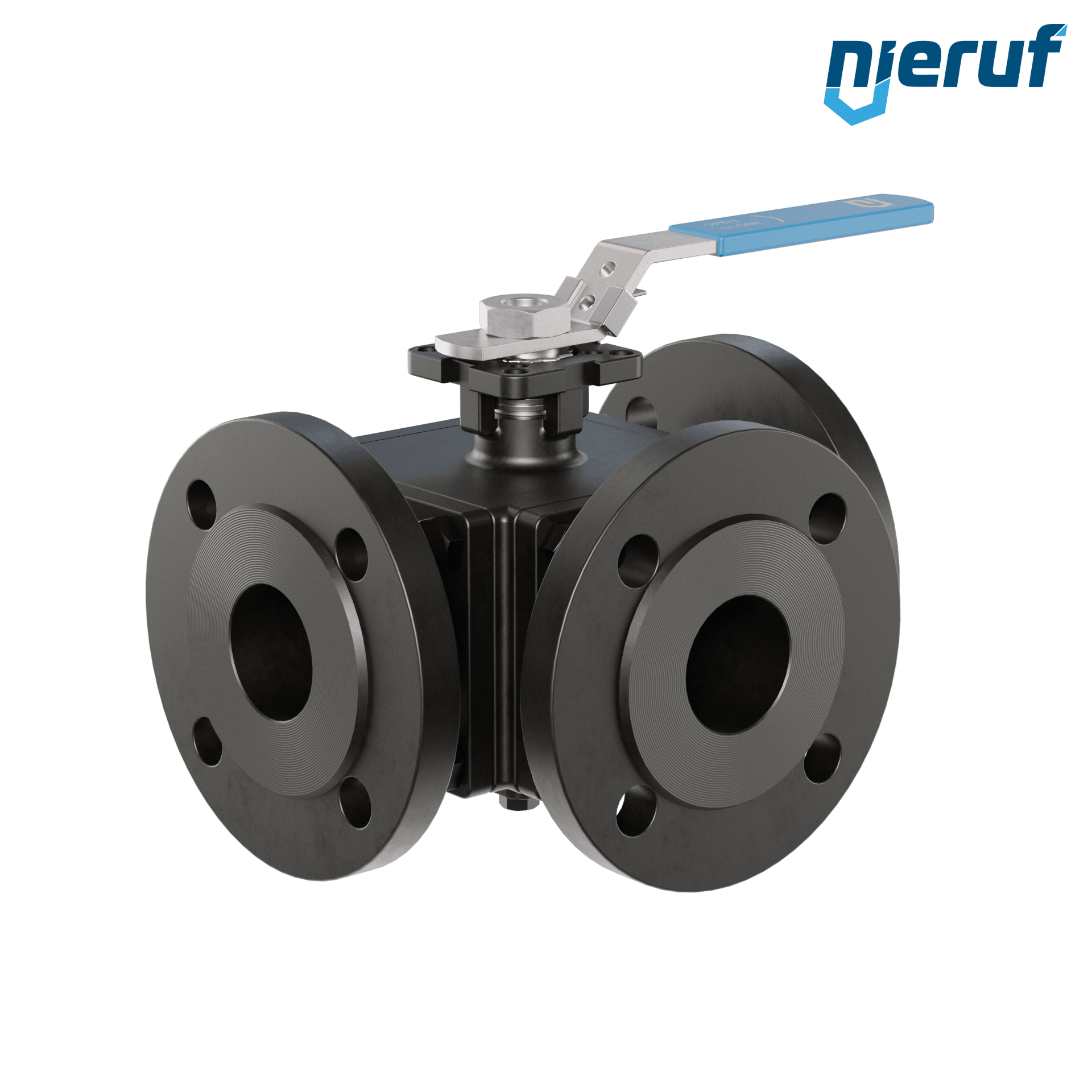 questa valvola a sfera flangiata a tre vie di alta qualità in acciaio fuso con copertura e flangia di montaggio secondo DIN ISO 5211 ha le seguenti omologazioni / certificazioni: PED 97/23 / EG, categoria 3 modulo H, TA-aria 2002. questa valvola a sfera ha un incavo a L (L1).