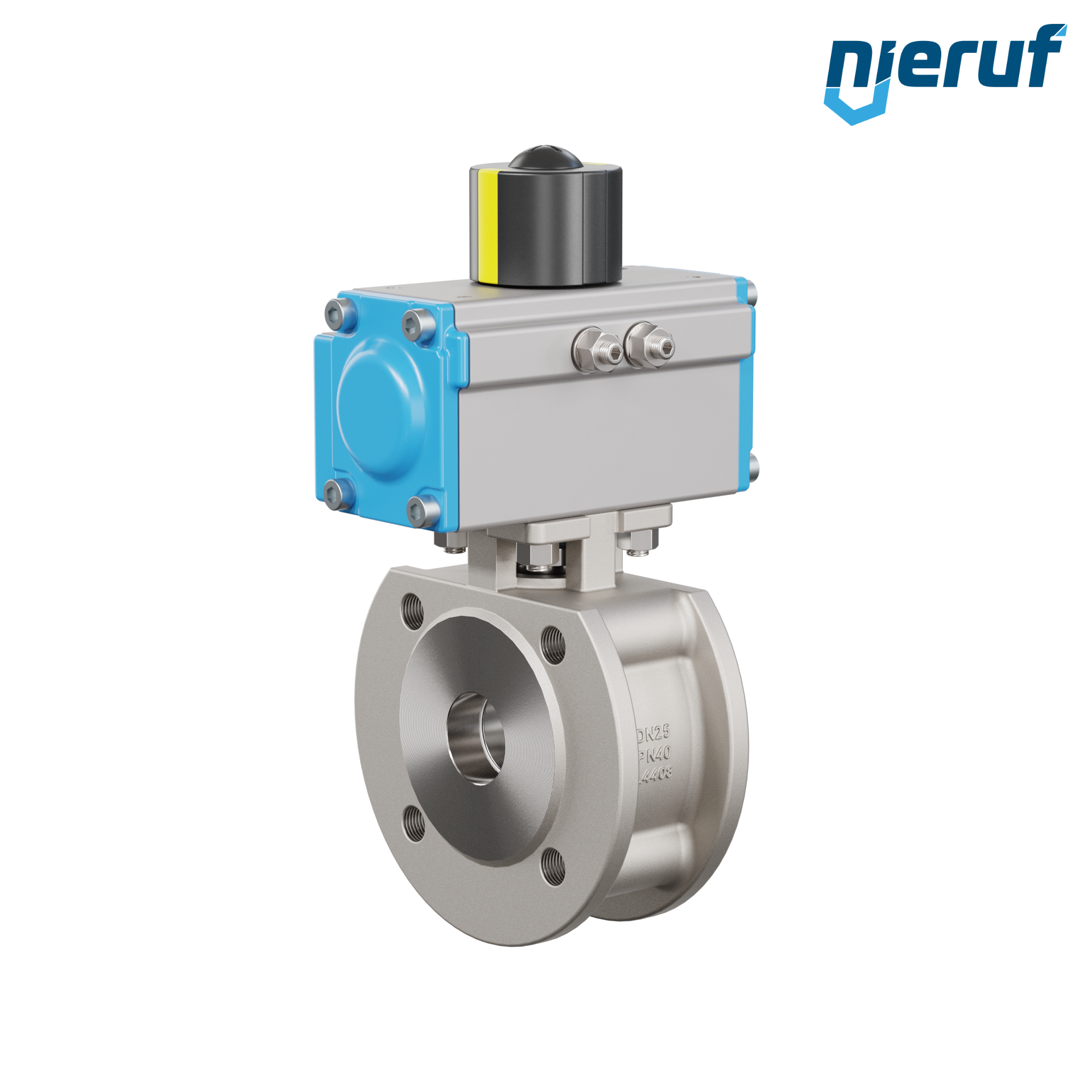 valvola a sfera flangiata dal design compatto DN25 acciaio inossidabile 1.4408 PK07 azionamento rotativo pneumatico GD48 in alluminio (funzionamento: GD = a doppio effetto)