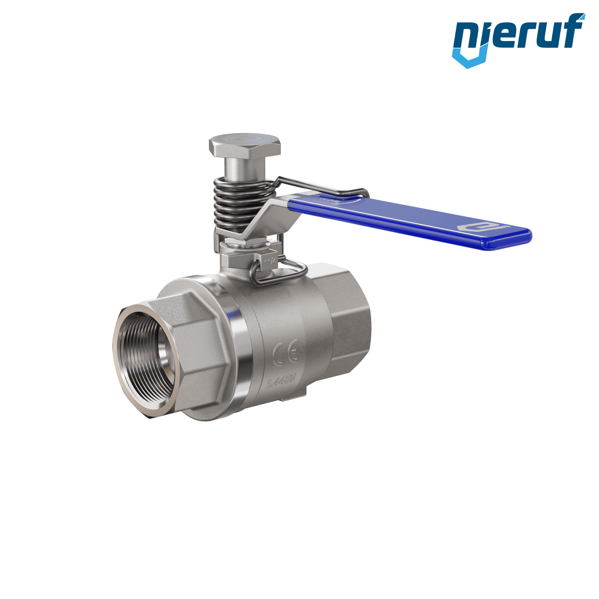 valvola a sfera con molla di ritorno DN32 - 1 1/4" pollici passaggio totale guarnizioni in PTFE per fluidi liquidi e gassosi in acciaio inossidabile 1.4408