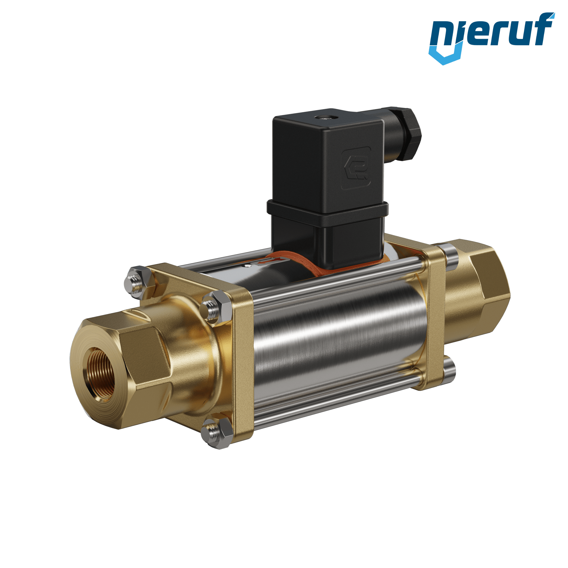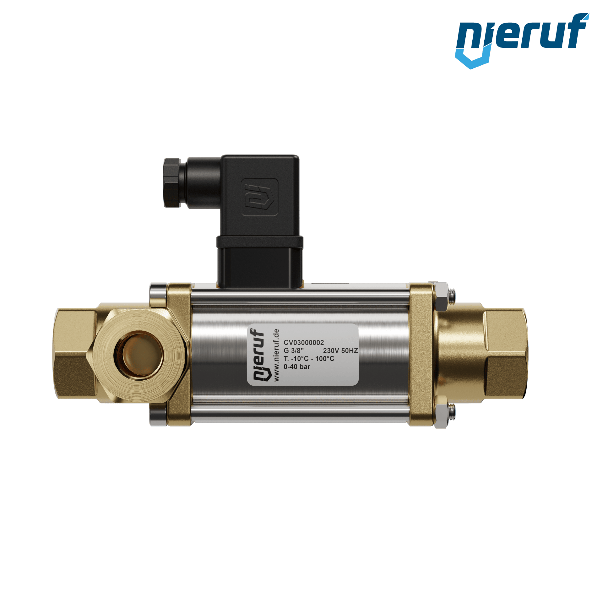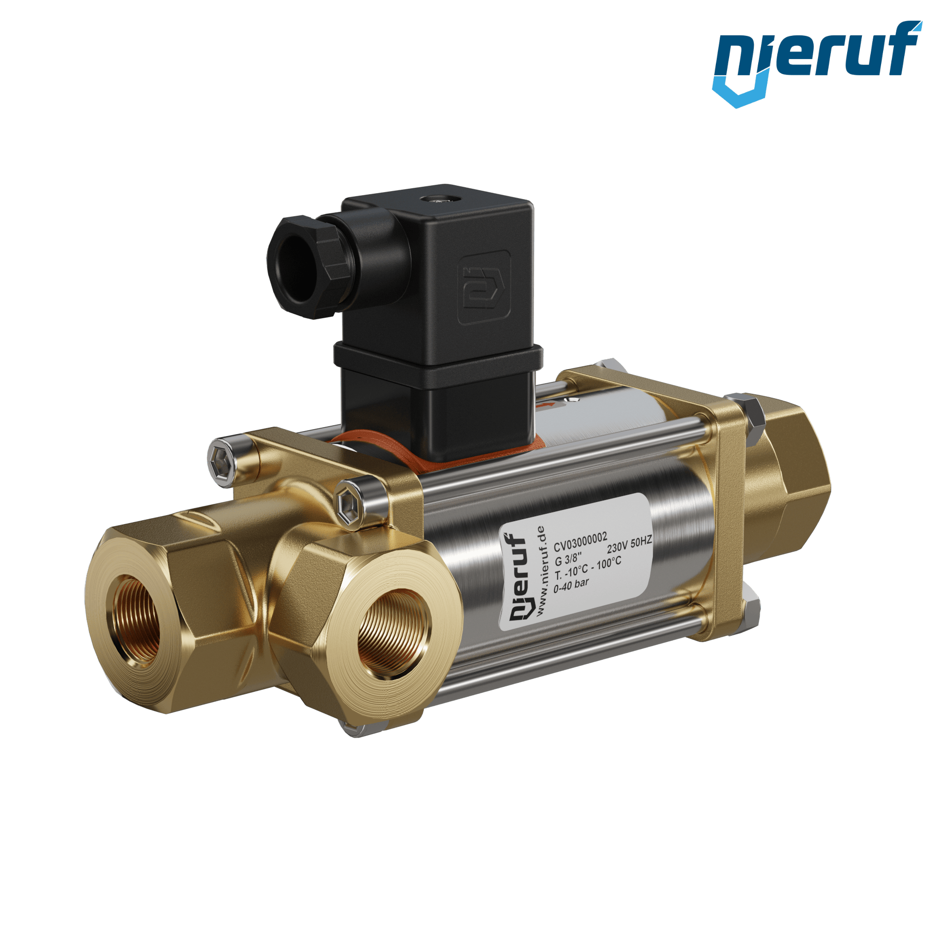 valvola coassiale a 3/2 vie 3/8" pollici IG - DN10 in ottone, a comando diretto fino ad un massimo di 40 bar, NC - normalmente chiusa, voltaggio 230V AC