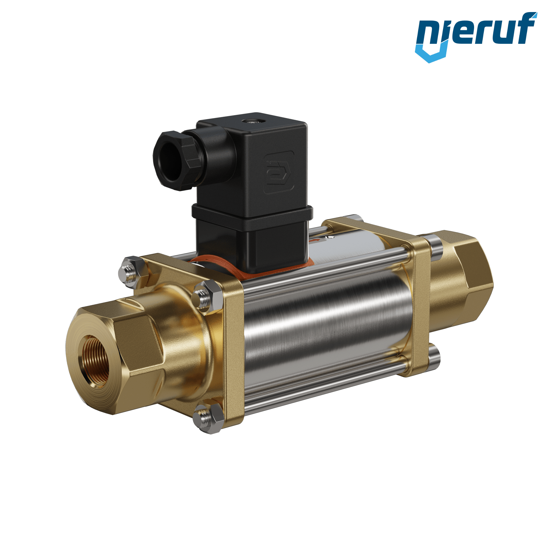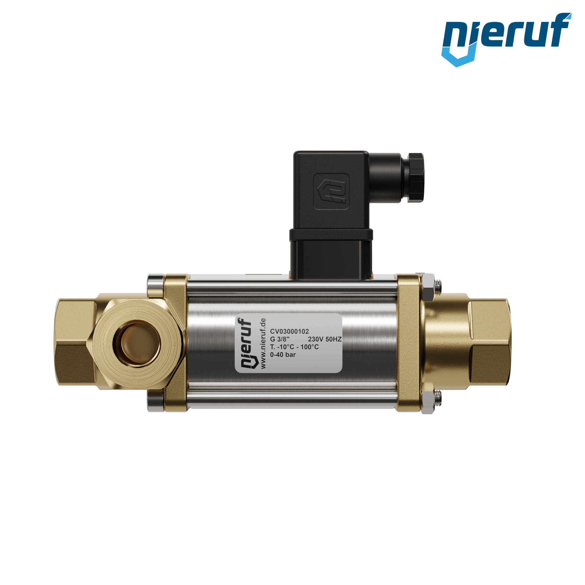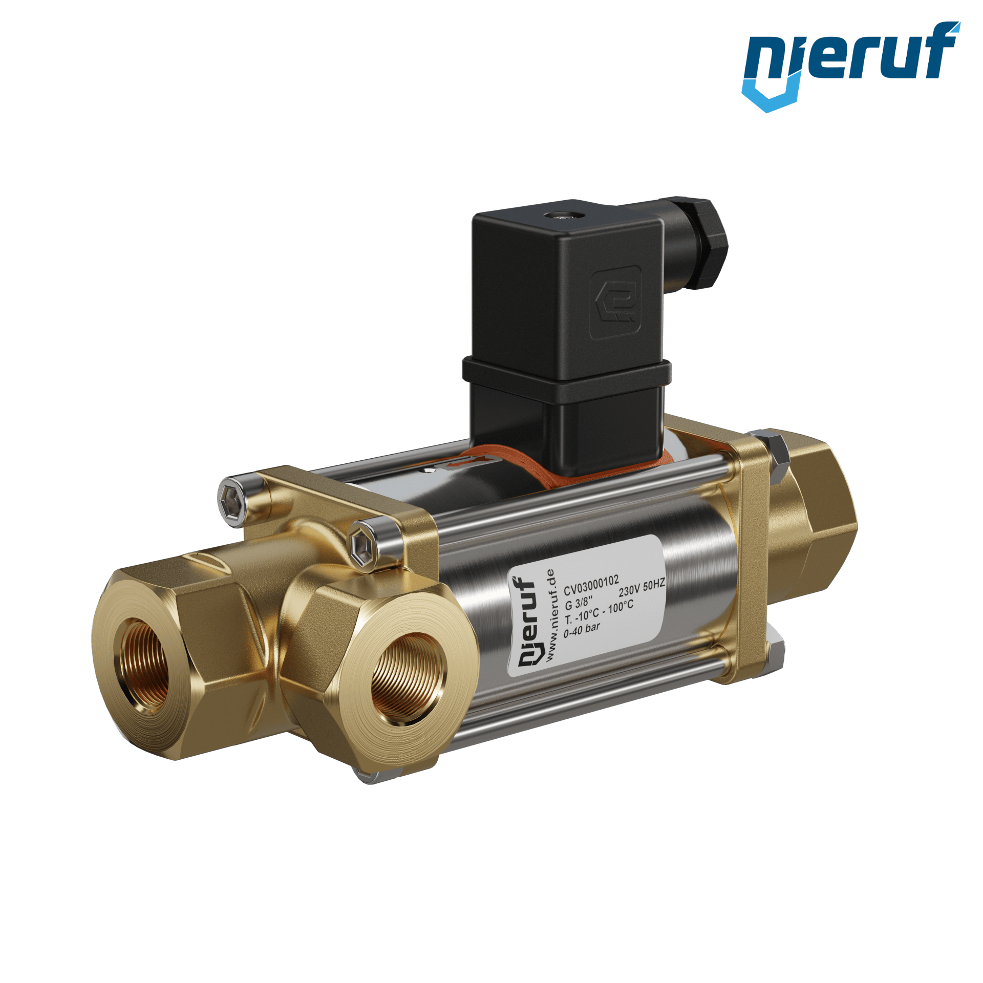 valvola coassiale a 3/2 vie 3/8" pollici IG - DN10 in ottone, a comando diretto fino ad un massimo di 40 bar, NO - normalmente aperta, voltaggio 230V AC