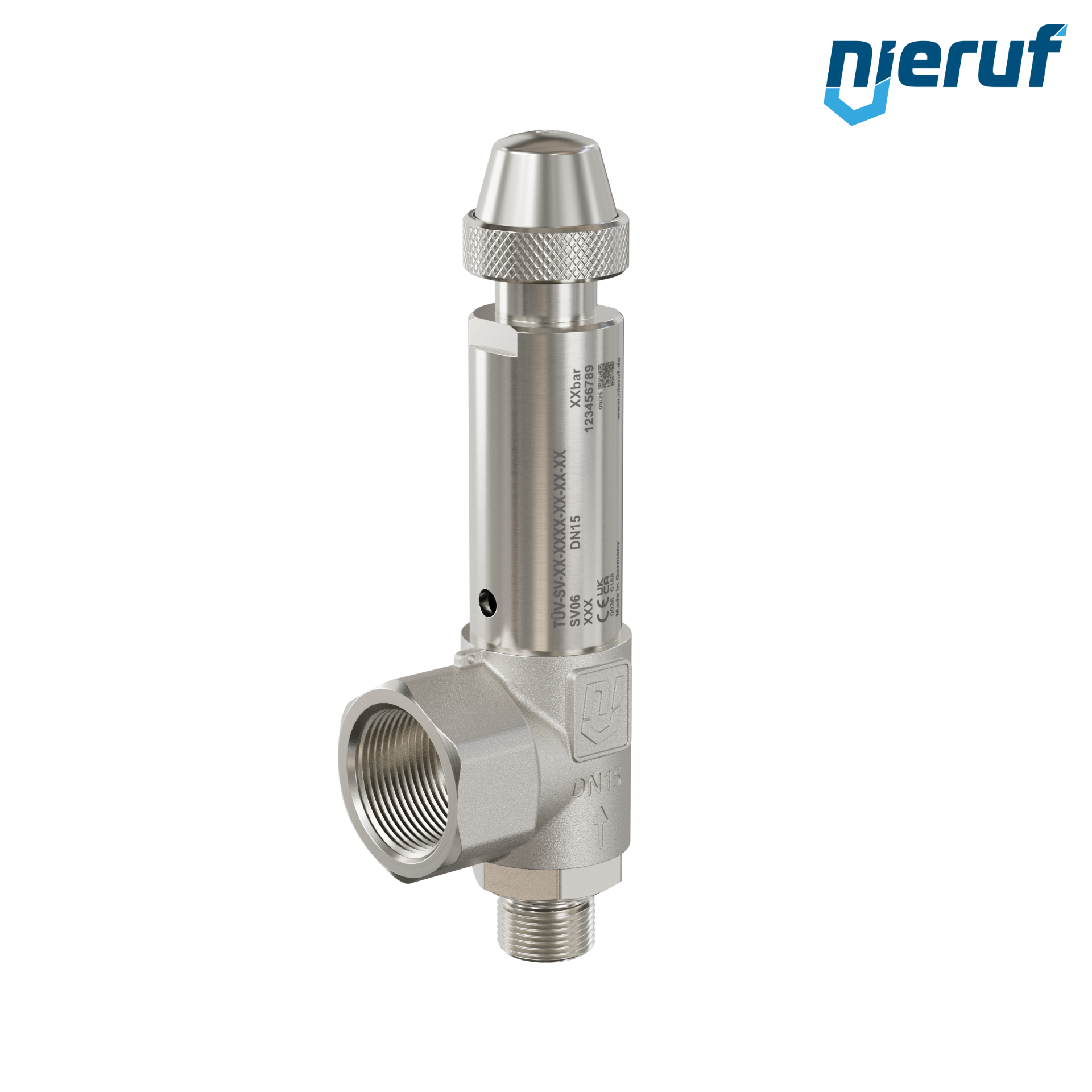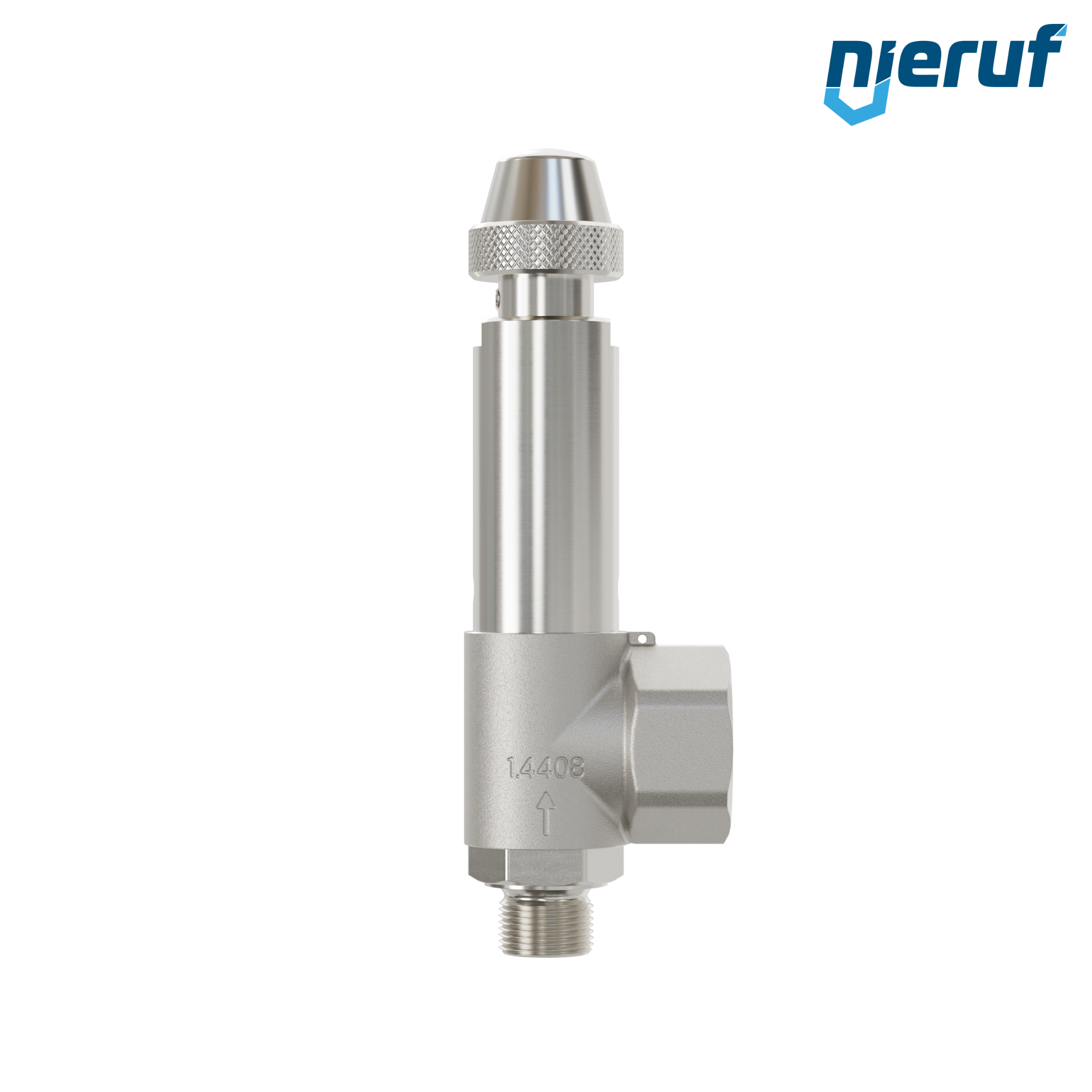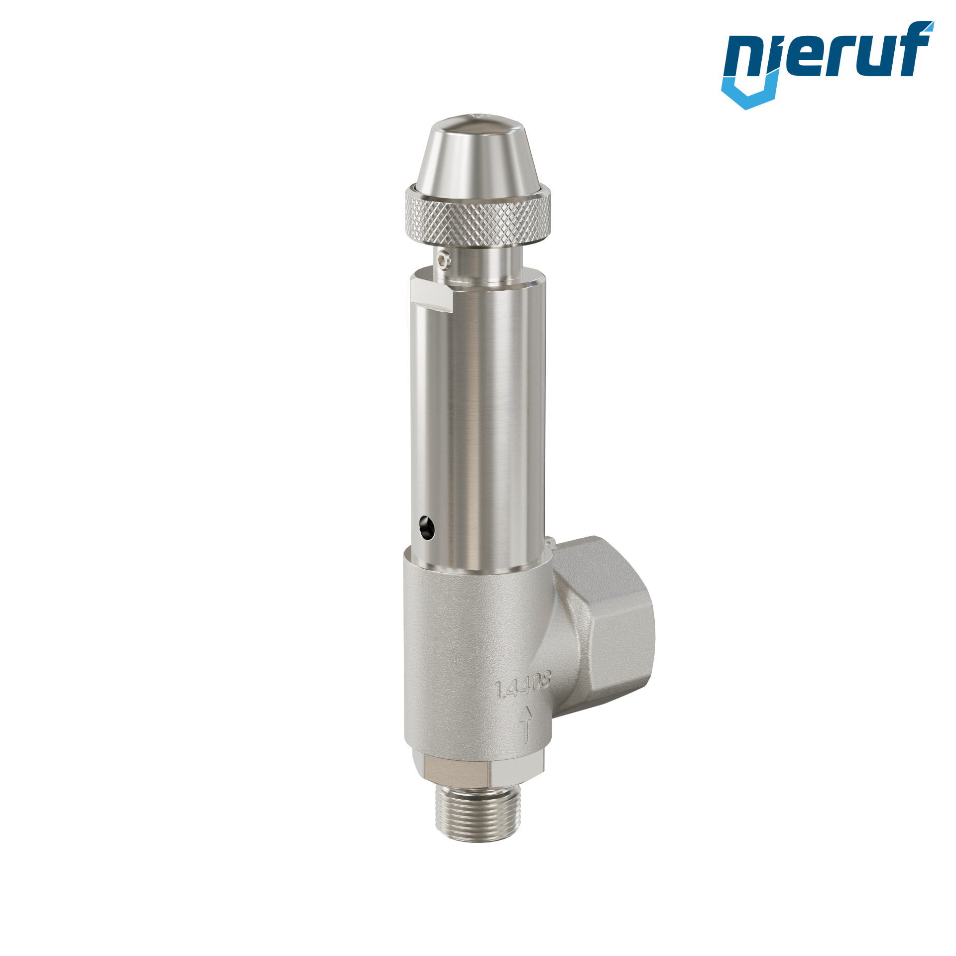 valvola di sicurezza ad angolo con manicotto di tenuta per fluidi liquidi NBR 1/2" M x 1" F acciaio inox modello SV06 con filettatura esterna BSP-P e meccanismo di sollevamento rotazionale