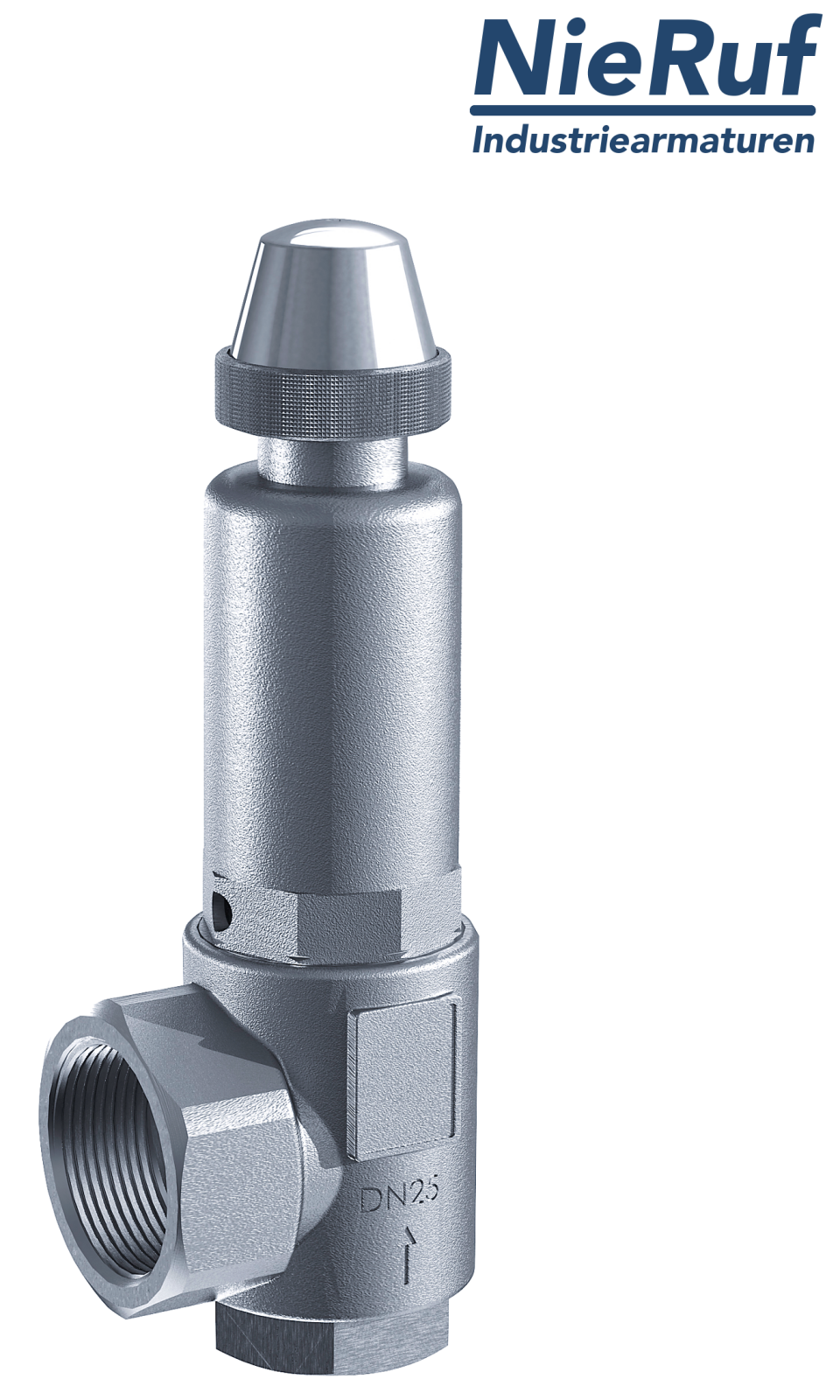 valvola di sicurezza 1/2" con manicotto di tenuta SV10 per fluidi gassosi in acciaio inox guarnizione NBR impostazione della pressione 0,5 - 25,0 bar- per pressioni più elevate è possibile avere la versione in PTFE meccanismo di sollevamento rotazionale