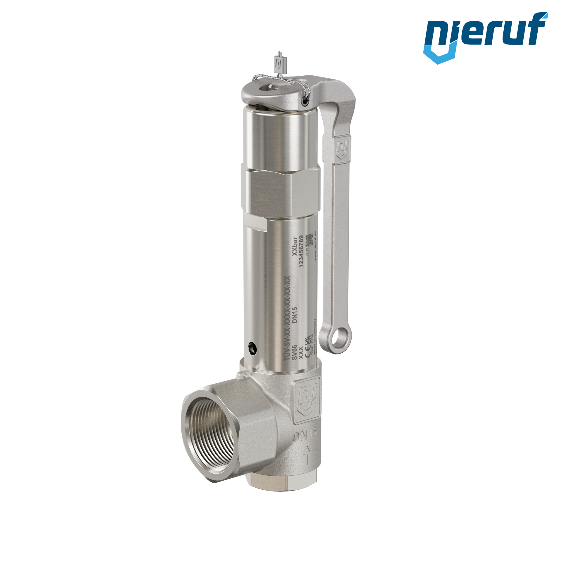valvola di sicurezza ad angolo FKM 1/2" x 1" F acciaio inox modello SV06 con filettatura interna BSP-P per fluidi liquidi in acciaio inox con con leva e con manicotto di tenuta