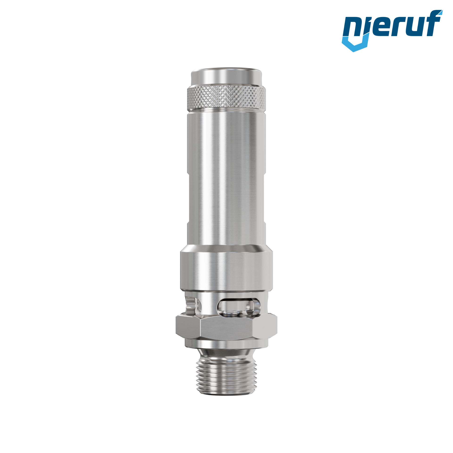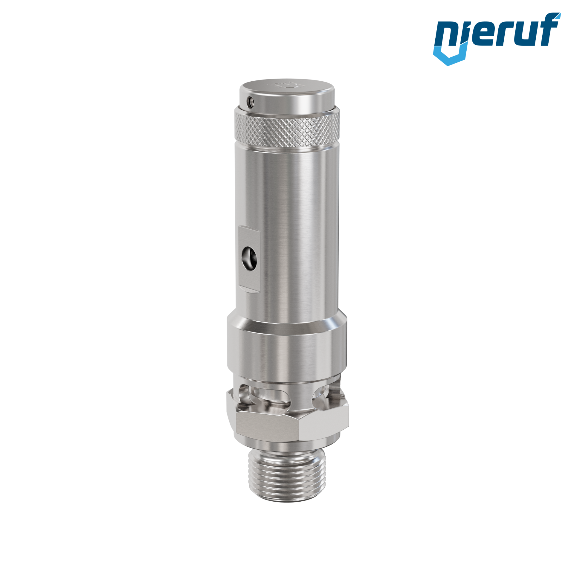 valvola di sicurezza 1/4" M tipo SV02 con scarico della valvola libero per aria compressa ed applicazioni pneumatiche, in acciaio inox con tenuta in FKM , taratura pressione 0,2 - 25,0 bar- per pressioni più elevate è possibile avere la versione in PTFE