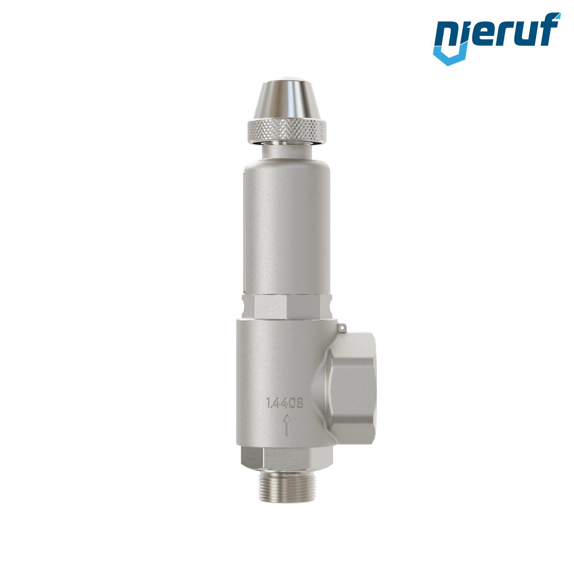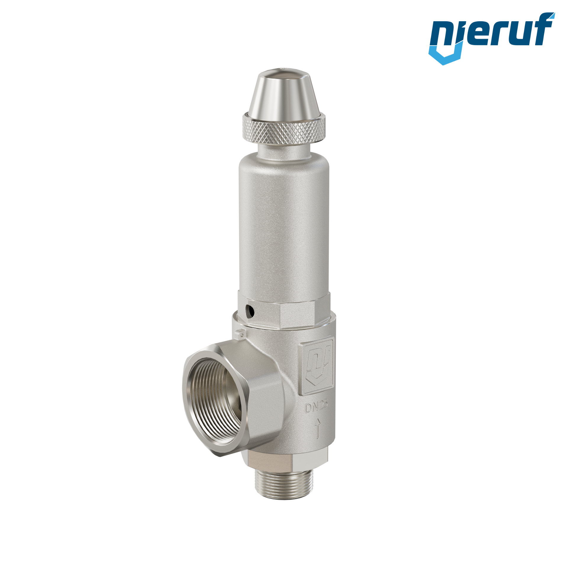 valvola di sicurezza ad angolo con manicotto di tenuta per fluidi liquidi 1" M x 1 1/2" F acciaio inox modello SV06 con filettatura esterna BSP-P PTFE-guarnizione e meccanismo di sollevamento rotazionale