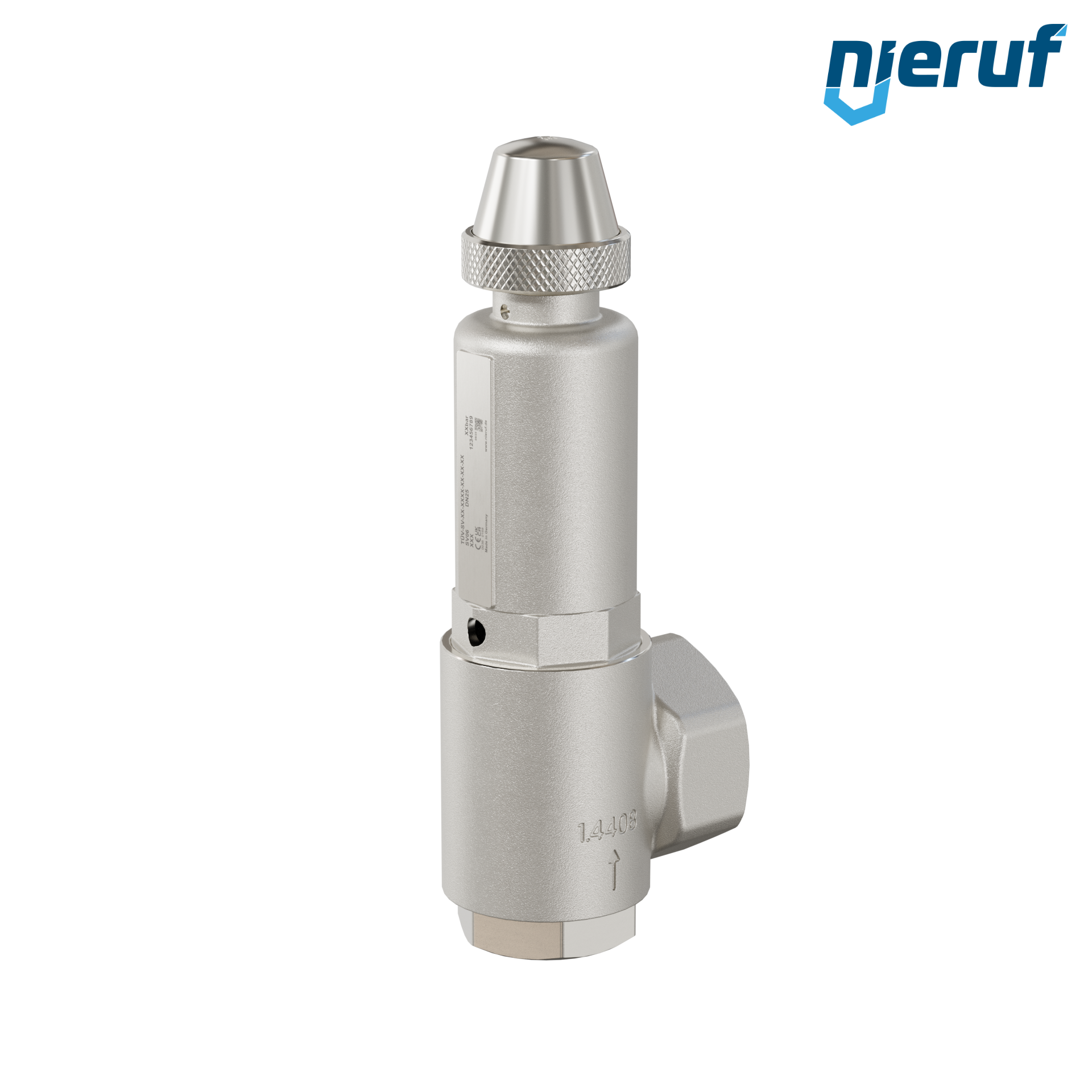 valvola di sicurezza ad angolo per fluidi liquidi 1" x 1 1/2" F con manicotto di tenuta acciaio inox modello SV06 con filettatura interna BSP-P EPDM-guarnizione e meccanismo di sollevamento rotazionale