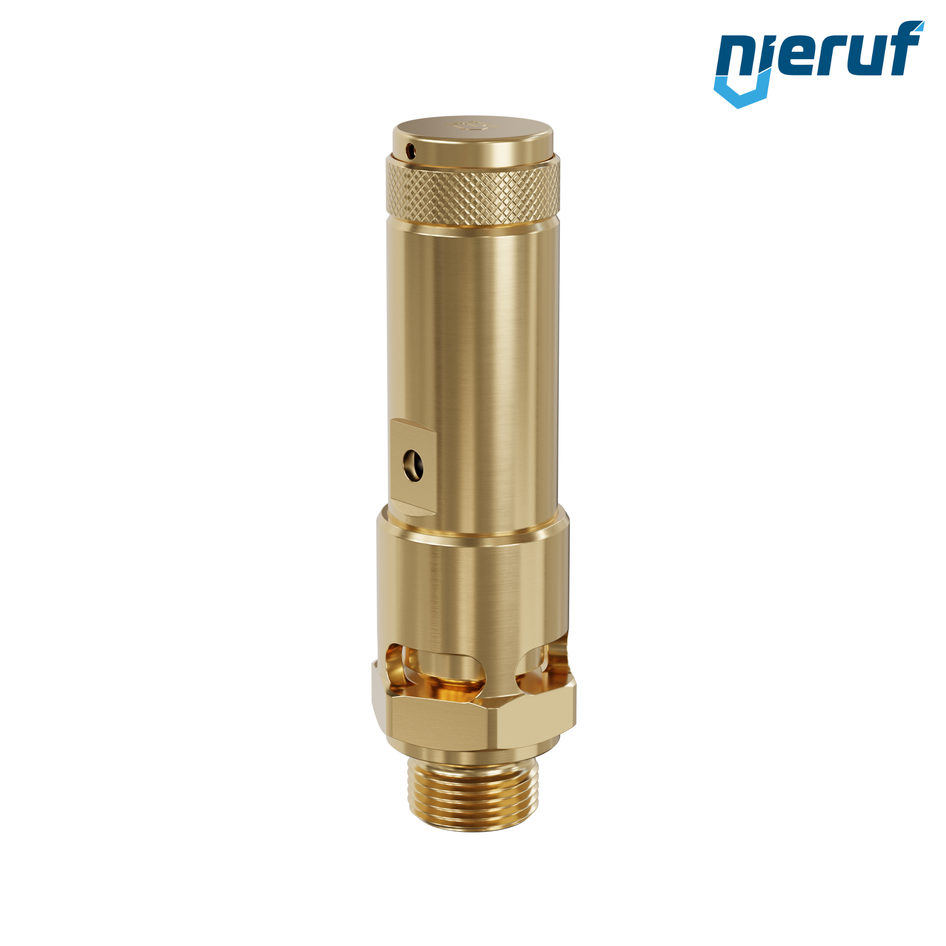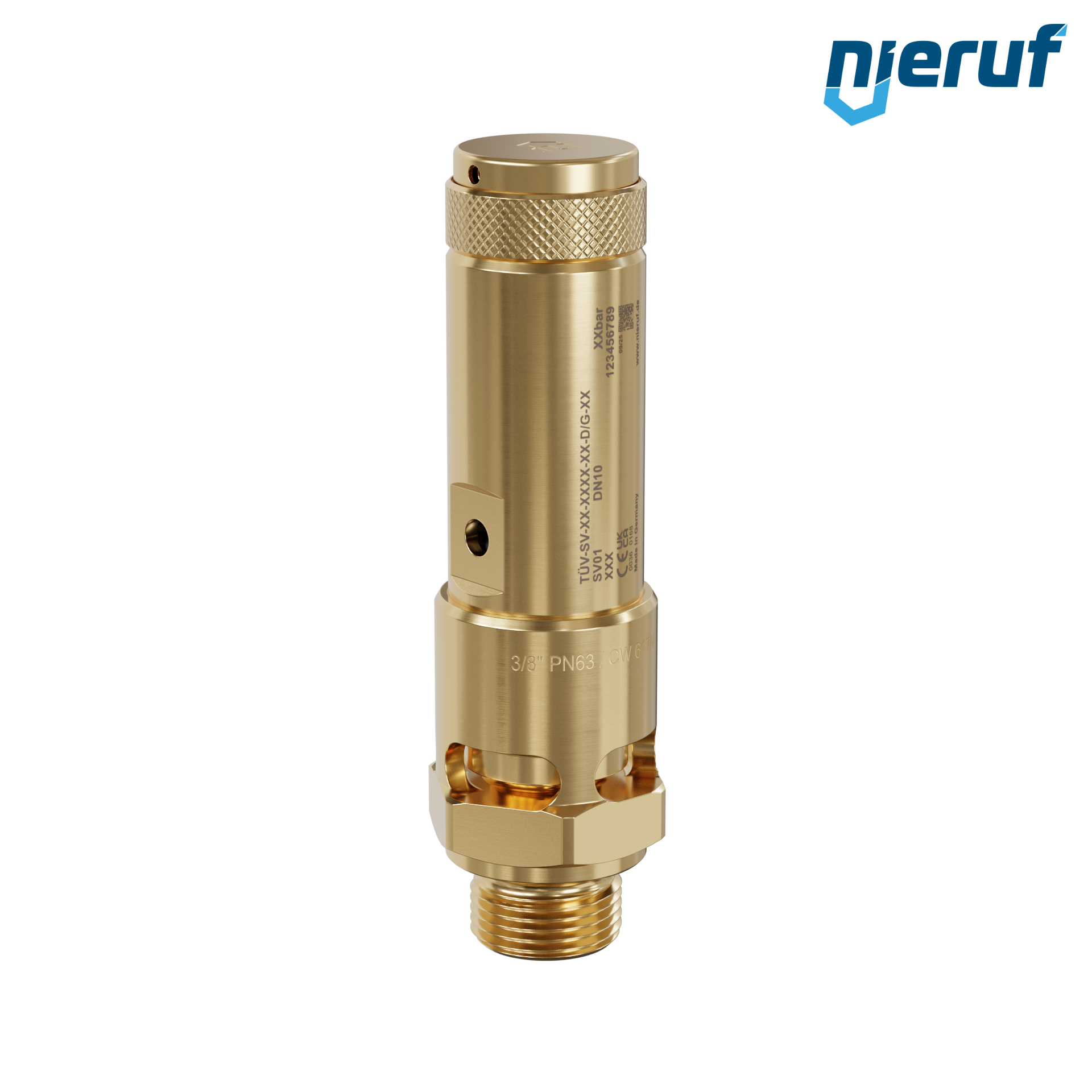 valvola di sicurezza 3/8" M tipo SV01 con scarico della valvola libero per aria compressa ed applicazioni pneumatiche, in ottone con tenuta in FKM , taratura pressione 0,2 - 25,0 bar- per pressioni più elevate è possibile avere la versione in PTFE