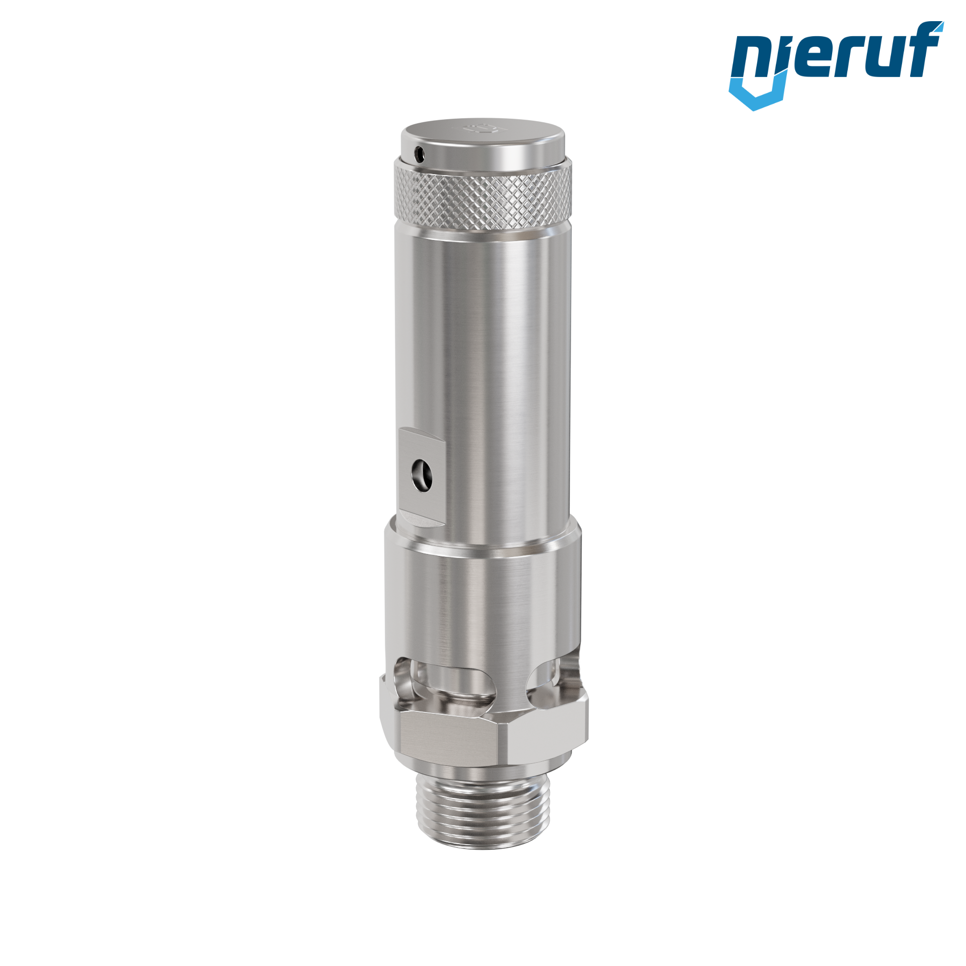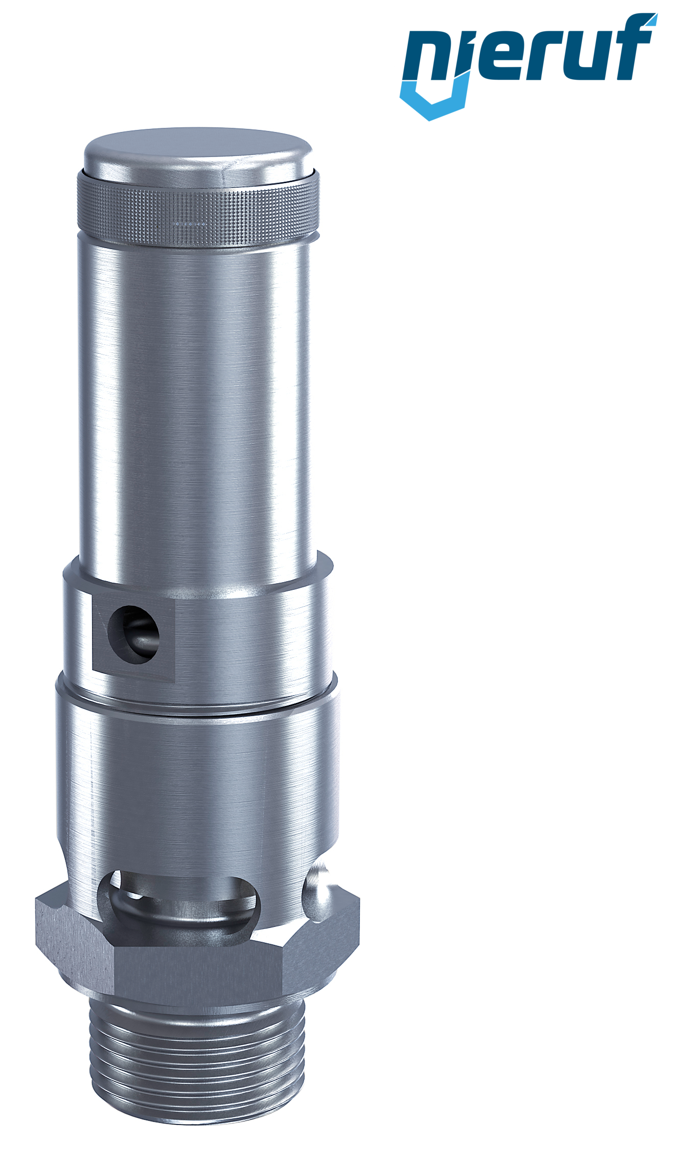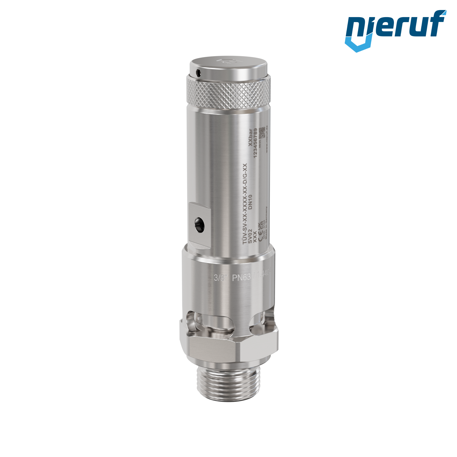 valvola di sicurezza 3/8" M tipo SV02 con scarico della valvola libero per aria compressa ed applicazioni pneumatiche, in acciaio inox con tenuta in FKM , taratura pressione 0,2 - 25,0 bar- per pressioni più elevate è possibile avere la versione in PTFE