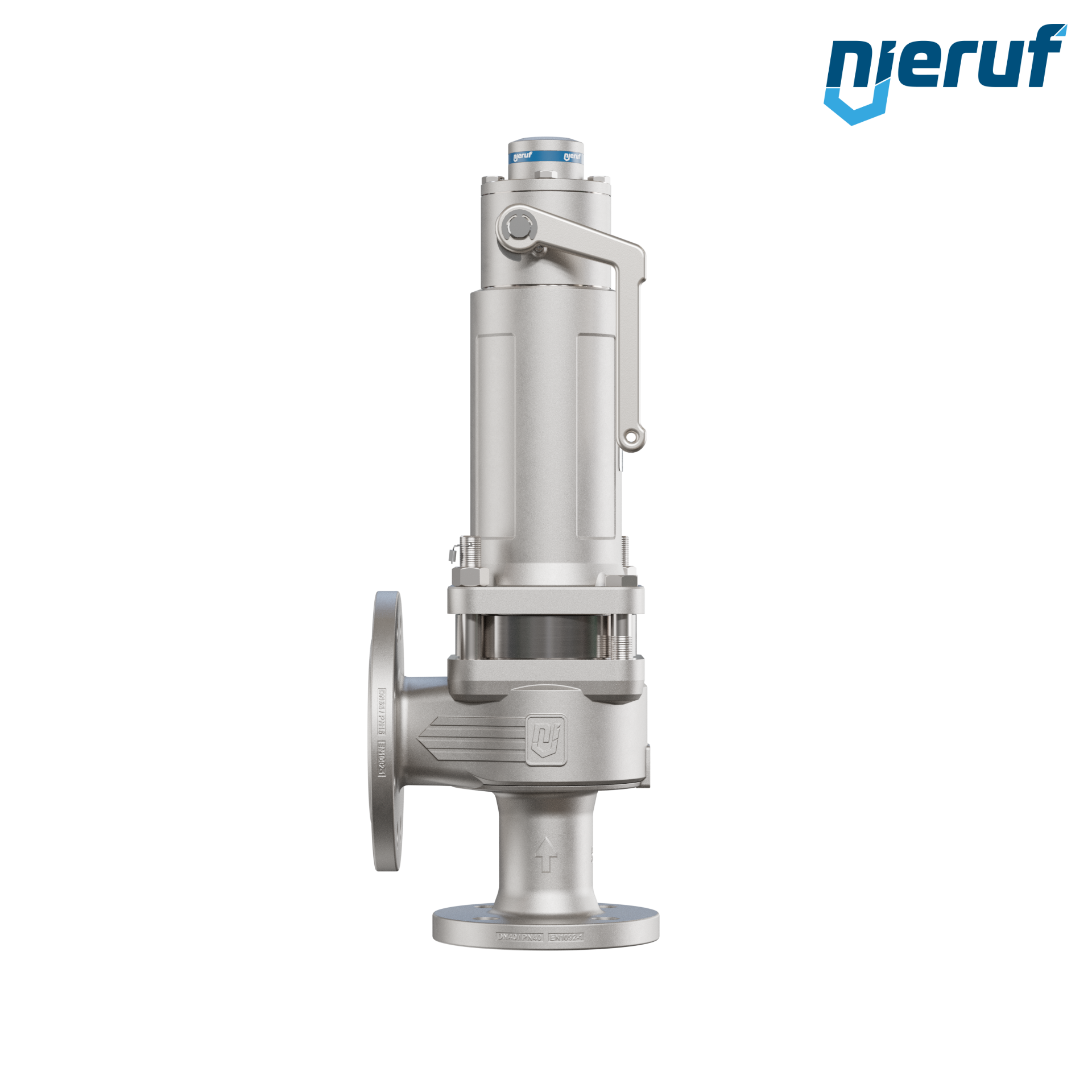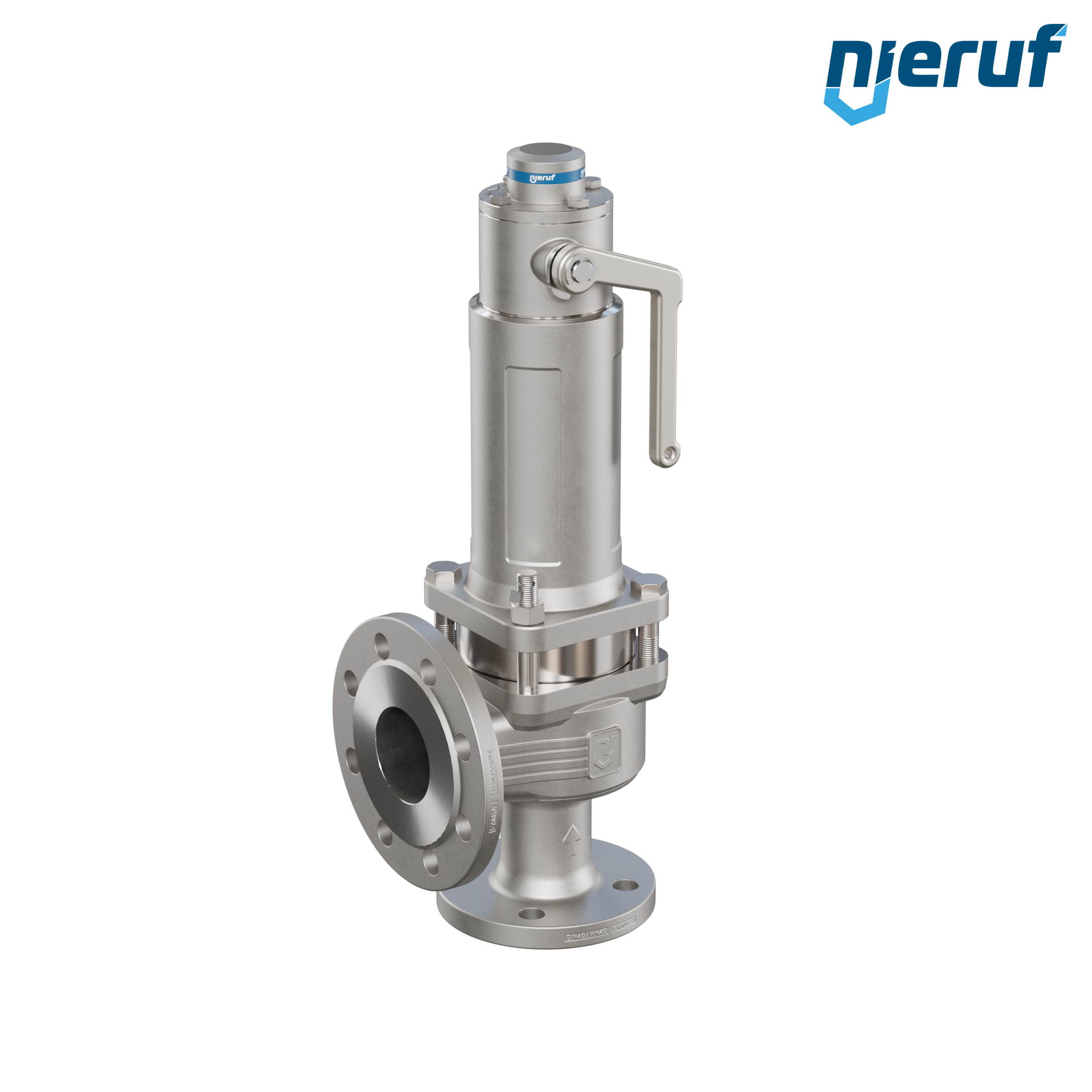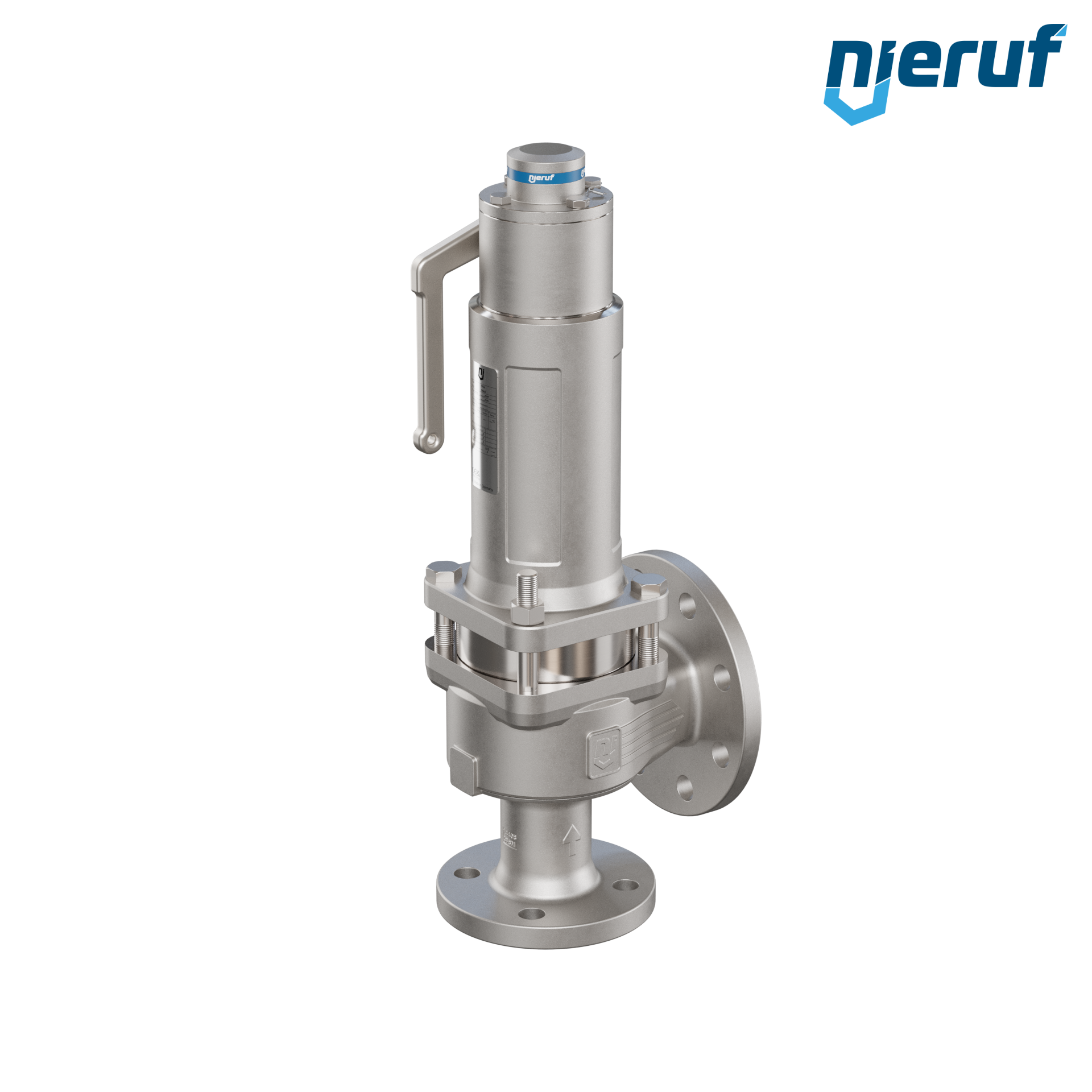valvola di sicurezza DN40/DN65 SF04 con manicotto di tenuta a gas in acciaio inox 1.4408 guarnizione PTFE impostazione della pressione 0,5 - 40,0 bar dispositivo di sollevamento con leva